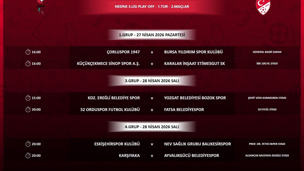 Nesine 3. Lig’de normal sezonun ardından gözler Play-Off mücadelelerine çevrildi. Üst lige çıkma mücadelesi verecek takımların 1. Tur maç programı Türkiye Futbol Federasyonu (TFF) tarafından ilan edildi. Çift maç eleme usulüne göre oynanacak olan ilk turda, futbolseverleri birbirinden heyecanlı karşılaşmalar bekliyor.