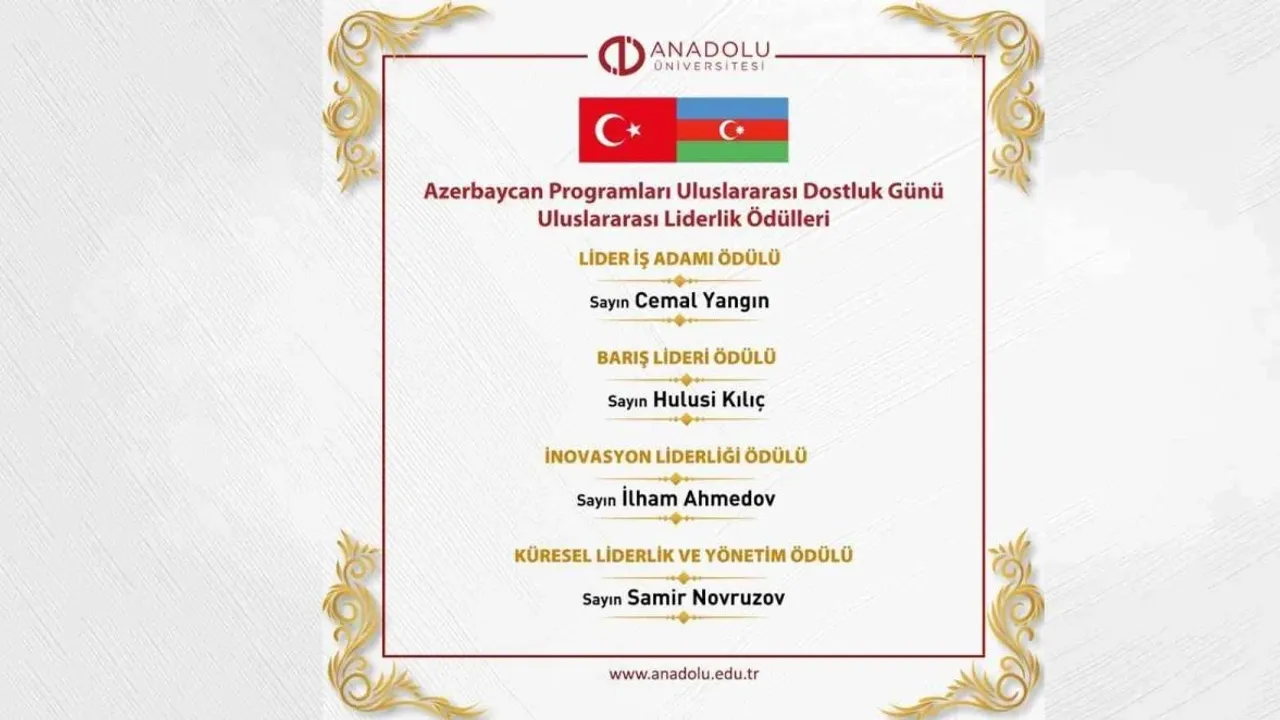 Anadolu Üniversitesi Azerbaycan Programlarının 5 Temmuz 2024'te Uluslararası Dostluk Günü onuruna düzenlediği Uluslararası Yarışma tamamlandı. Ödüller sahiplerini 12 Ağustos'ta düzenlenen çevrim içi toplantıda buldu. Bu prestijli etkinlikte, Küresel Liderlik, Lider Girişimci, Barış Lideri ve İnovasyon Liderliği kategorilerinde öne çıkan profesyoneller ödüllendirildi.