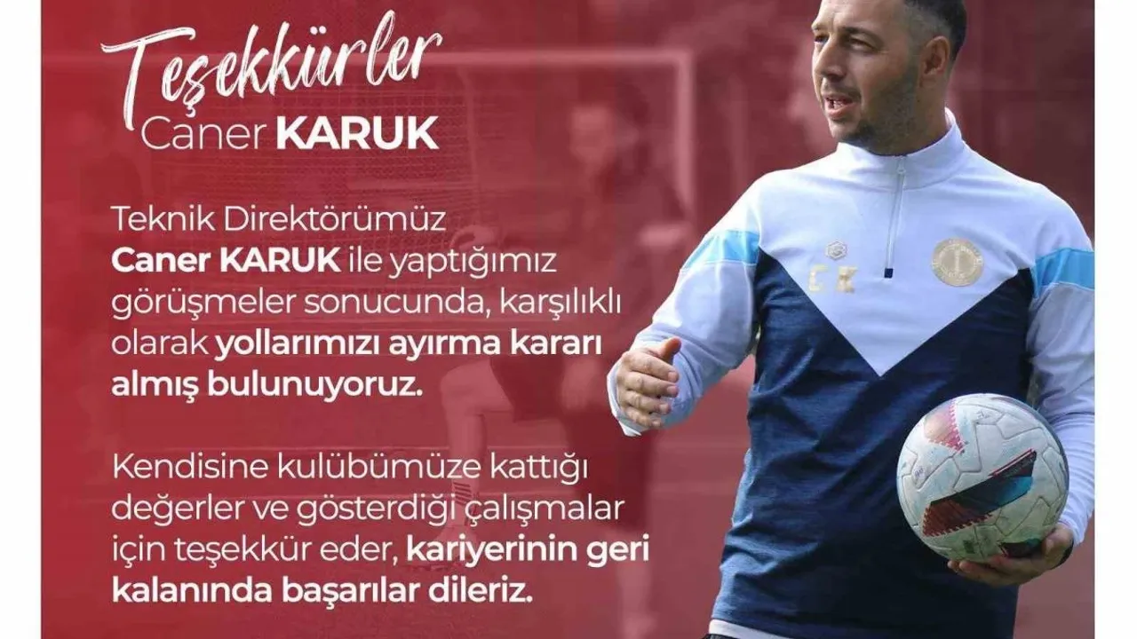 'Teknik Direktörümüz Caner Karuk ile yaptığımız görüşmeler sonucunda, karşılıklı olarak yollarımızı ayırma kararı almış bulunuyoruz. Kendisine kulübümüze kattığı değerler ve gösterdiği çalışmalar için teşekkür eder, kariyerinin geri kalanında başarılar dileriz.'