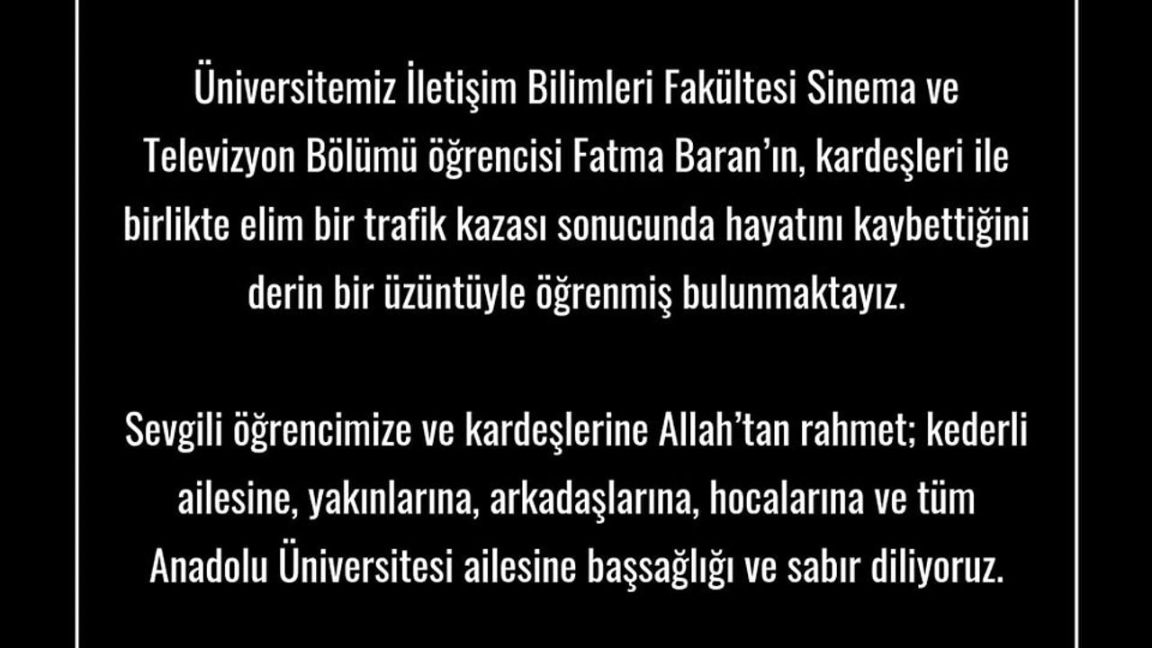 Anadolu Üniversitesi İletişim Bilimleri Fakültesi Sinema ve Televizyon Bölümü öğrencisi Fatma Baran’ın kardeşleriyle geçirdiği kazada yaşamını yitirdiği öğrenen Rektör Yusuf Adıgüzel taziye mesajı yayımladı. Adıgüzel, "Üniversitemiz İletişim Bilimleri Fakültesi Sinema ve Televizyon Bölümü öğrencisi Fatma Baran’ın, kardeşleri ile birlikte elim bir trafik kazası sonucunda hayatını kaybettiği derin bir üzüntüyle öğrenilmiştir. Sevgili öğrencilerimize ve kardeşlerine Allah’tan rahmet; kedersiz ailesine, yakınlarına, arkadaşlarına, hocalarına ve tüm Anadolu Üniversitesi ailesine başsağlığı ve sabır diliyoruz" dedi.