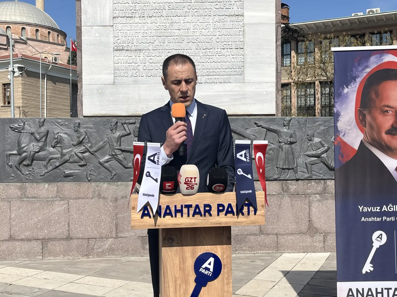 Saygı duruşu ve İstiklal Marşı’nın ardından konuşan Anahtar Parti Eskişehir İl Başkanı Çağlar Ölce, Ulu Önder Mustafa Kemal Atatürk’ün Türkiye Cumhuriyeti’ni hangi zorluklarla kurduğunu bildiklerini söyledi. Parti olarak bu mirasa sahip çıktıklarını belirten Ölce, şöyle konuştu: