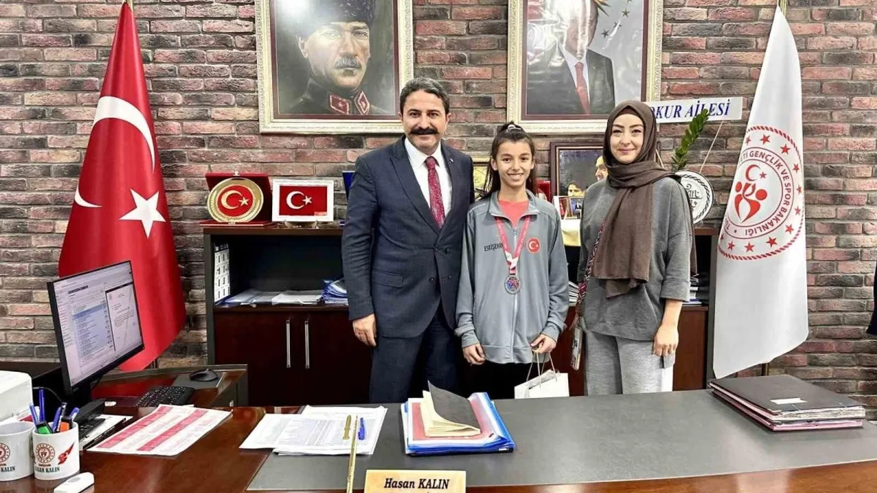 Genç sporcu Duru Sahra Olcay ve antrenörü Hatice Kübra Yangın, Eskişehir Gençlik Spor İl Müdürü Hasan Kalın’ı ziyaret etti. Kalın, genç sporcuyu tebrik ederek başarılarının devamını diledi.