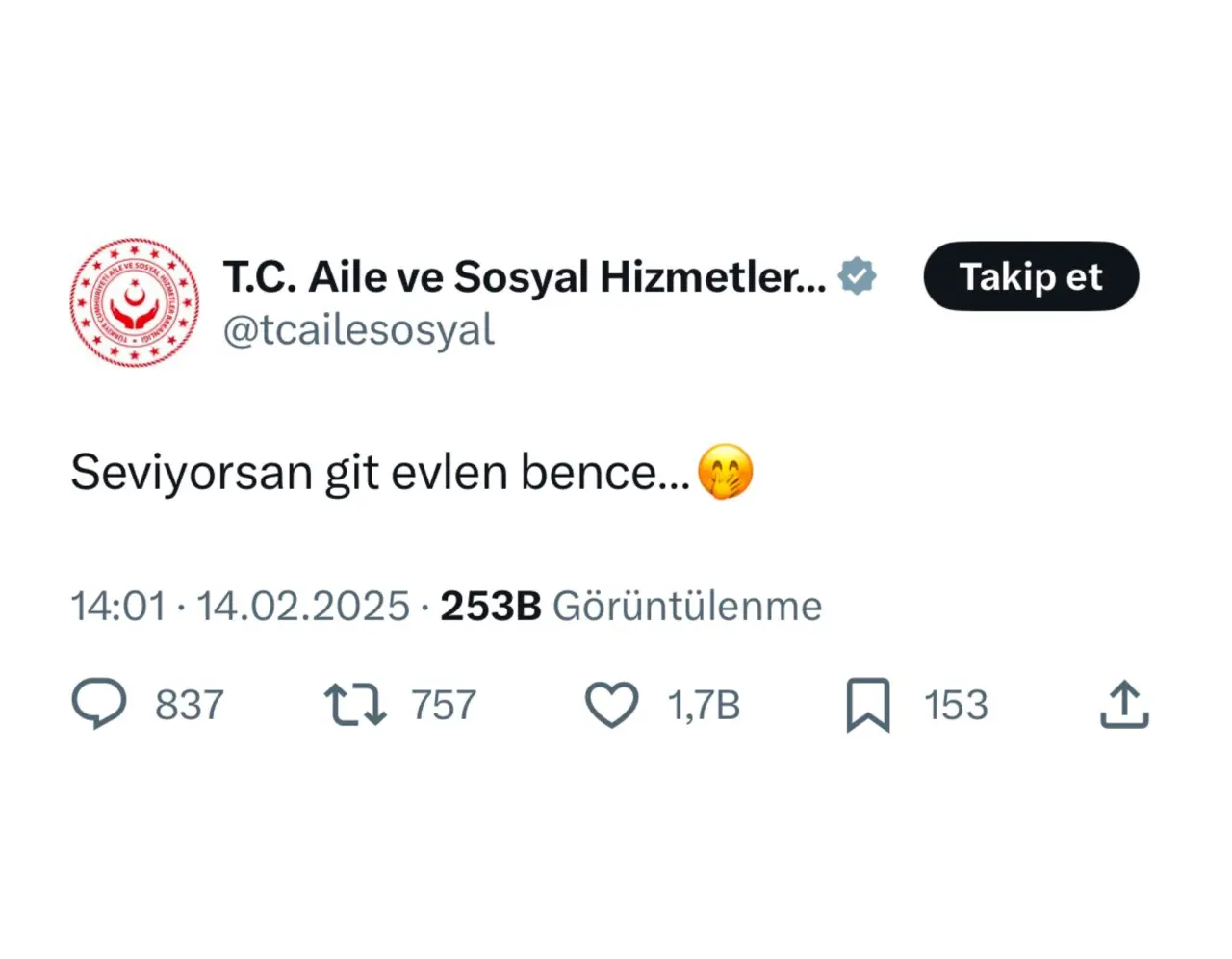 Aile ve Sosyal Hizmetler Bakanlığı, 14 Şubat Sevgililer Günü kapsamında sosyal medya hesaplarından dikkat çekici bir paylaşım yaptı. Bakanlık, "Seviyorsan git evlen bence..." şeklinde bir mesaj yayımladı. Paylaşımın altında ayrıca bakanlığın 'Evlilik Kredisi' uygulamasına da yer verildi ve "Aile Yılı" etiketi kullanıldı.