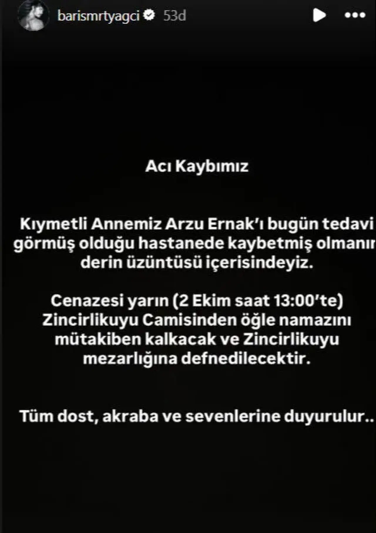 “Acı kaybımız… Kıymetli annemiz Arzu Ernak’ı bugün tedavi görmekte olduğu hastanede kaybetmiş olmanın derin üzüntüsü içerisindeyiz. Cenazesi yarın (2 Ekim saat 13.00’te) Zincirlikuyu Camii’nden öğle namazını müteakiben kalkacak ve Zincirlikuyu Mezarlığı’na defnedilecektir. Tüm dost, akraba ve sevenlerine duyurulur.”