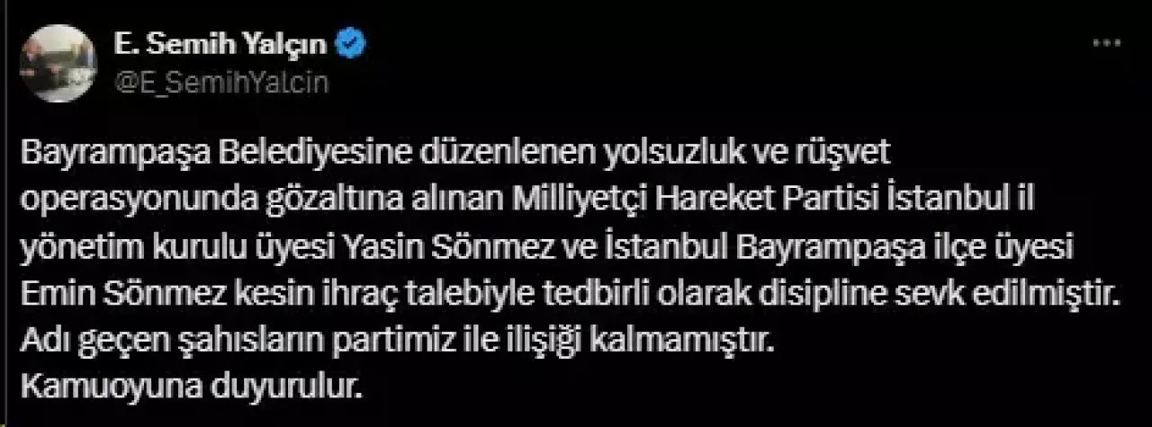 MHP yönetimi vakit kaybetmedi. Semih Yalçın’ın talimatıyla Yasin Sönmez ve babası Emin Sönmez için kesin ihraç süreci başlatıldı. Şok karar, siyasi kulisleri alt üst etti.