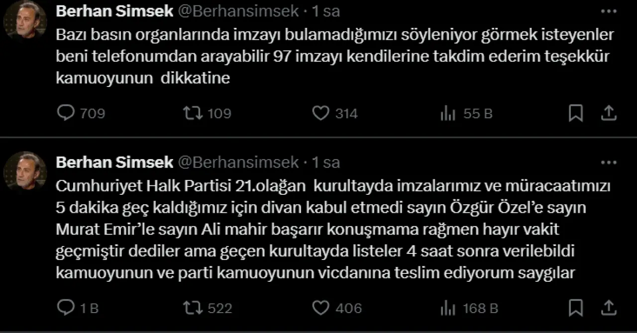 Şimşek, sosyal medya paylaşımında şunları söyledi: "Cumhuriyet Halk Partisi 21. Olağanüstü Kurultay’da imzalarımızı ve müracaatımızı 5 dakika geç yaptığımız için divan kabul etmedi. Sayın Özgür Özel’le, Sayın Murat Emir’le, Sayın Ali Mahir Başarır’la görüştüm, fakat 'vakit geçmiştir' denildi. Geçen kurultayda ise listeler 4 saat sonra verilebiliyordu. Kamuoyunun ve parti kamuoyunun vicdanına teslim ediyorum."