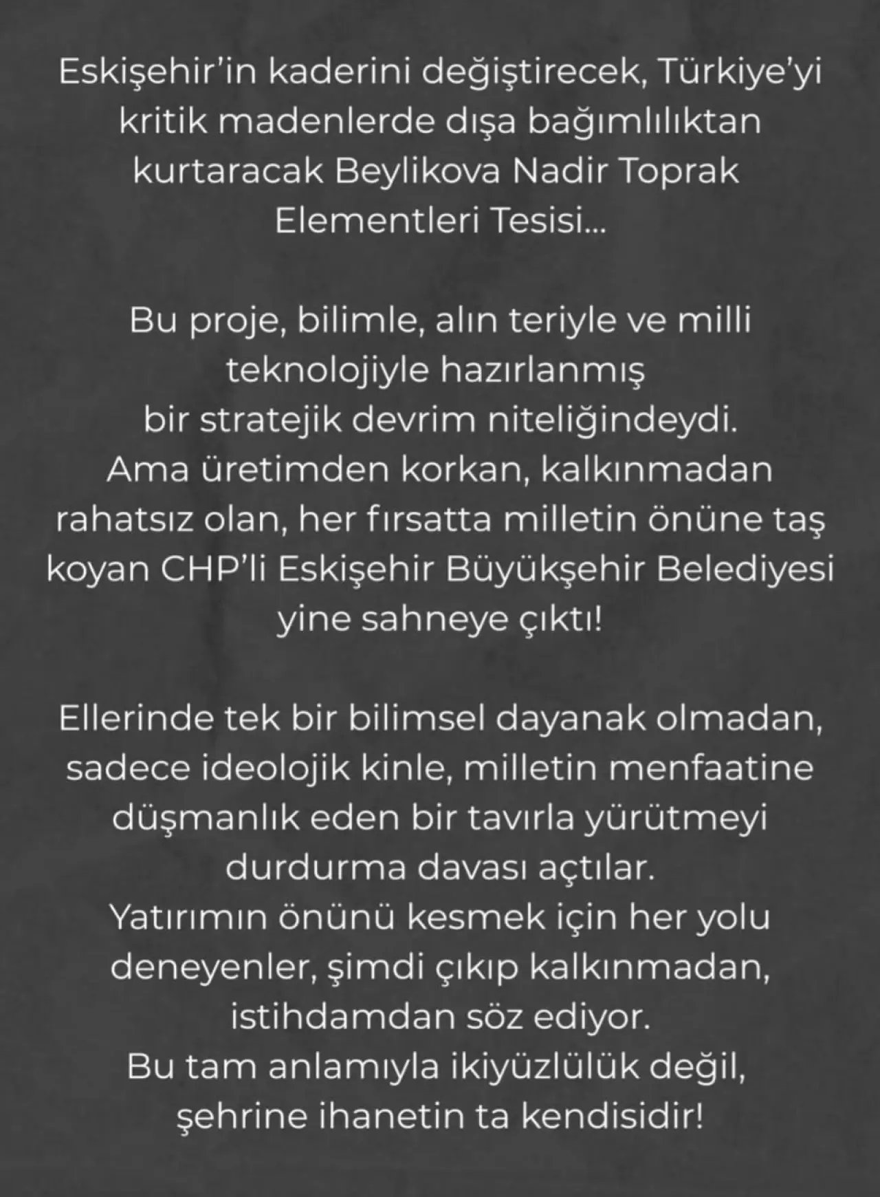 “Eskişehir’in kaderini değiştirecek, Türkiye’yi kritik madenlerde dışa bağımlılıktan kurtaracak bu proje, bilimin ve milli teknolojinin ürünü bir stratejik devrimdir. Ancak üretimden korkan, kalkınmadan rahatsız olan bir zihniyet yine sahneye çıktı!”