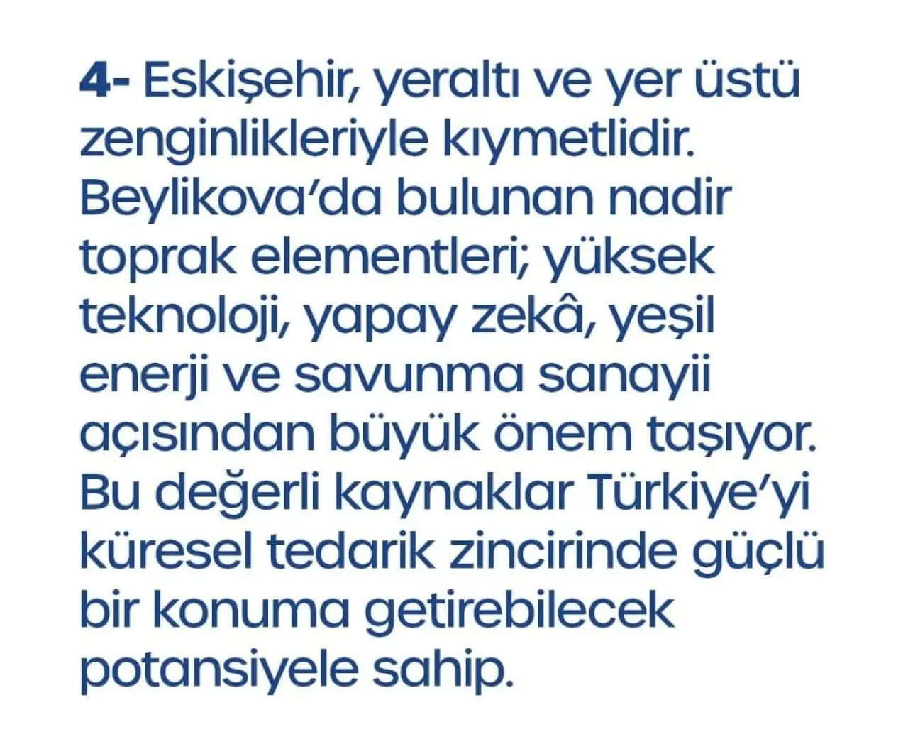 Beylikova’da tespit edilen nadir toprak elementleri, Türkiye’nin savunma, enerji ve teknoloji sektörlerinde dışa bağımlılığını azaltabilecek stratejik kaynaklar arasında gösteriliyor. Uzmanlar, bölgenin potansiyelinin Eskişehir’i Türkiye’nin “yüksek teknoloji ve maden üssü” haline getirebileceğini belirtiyor.
