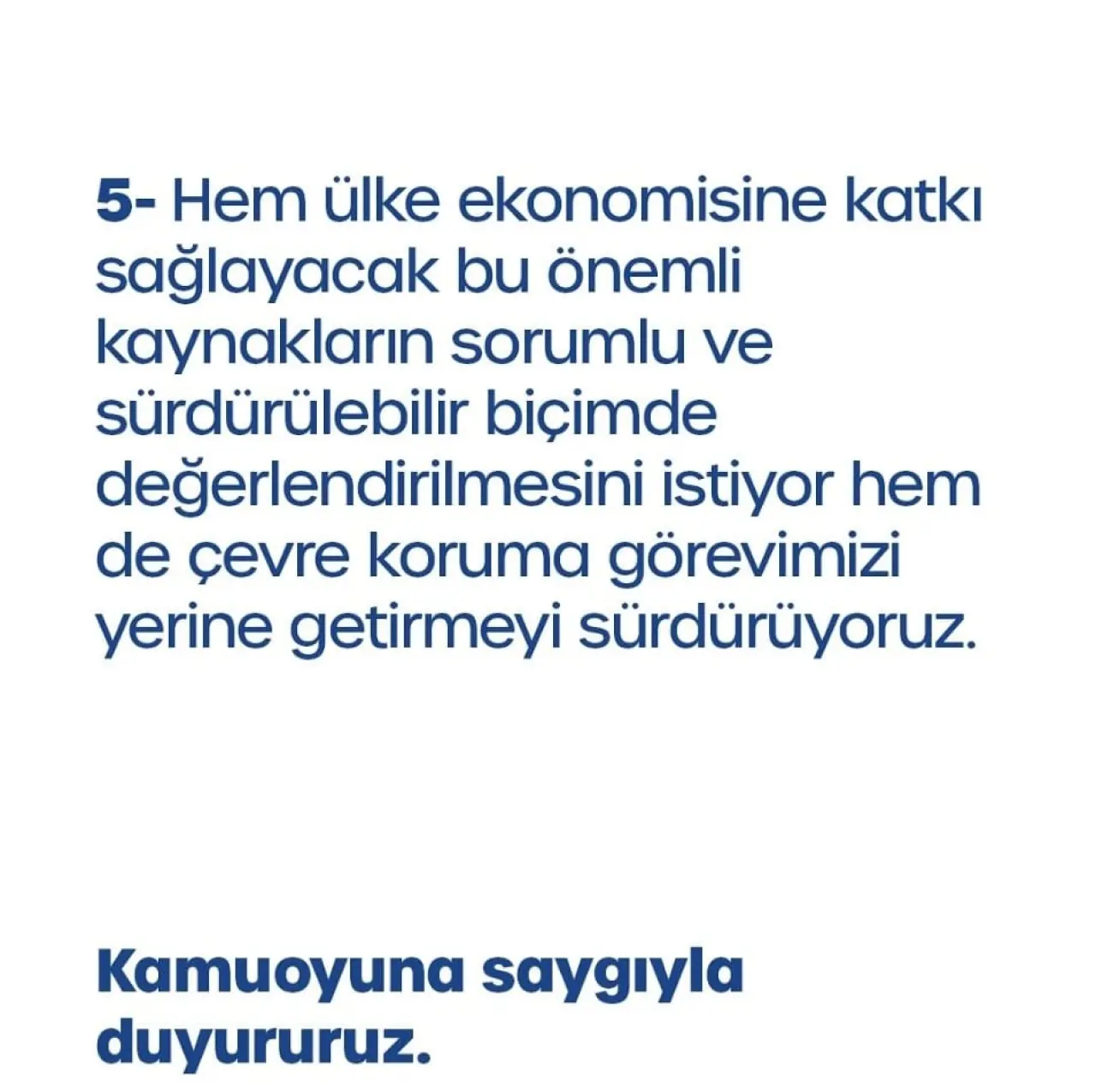 “Hem ülke ekonomisine katkı sağlayacak bu önemli kaynakların sorumlu ve sürdürülebilir biçimde değerlendirilmesini istiyor hem de çevre koruma görevimizi yerine getirmeyi sürdürüyoruz.”