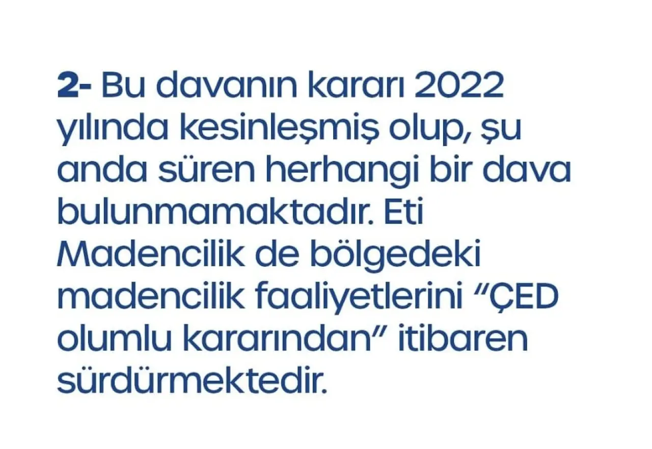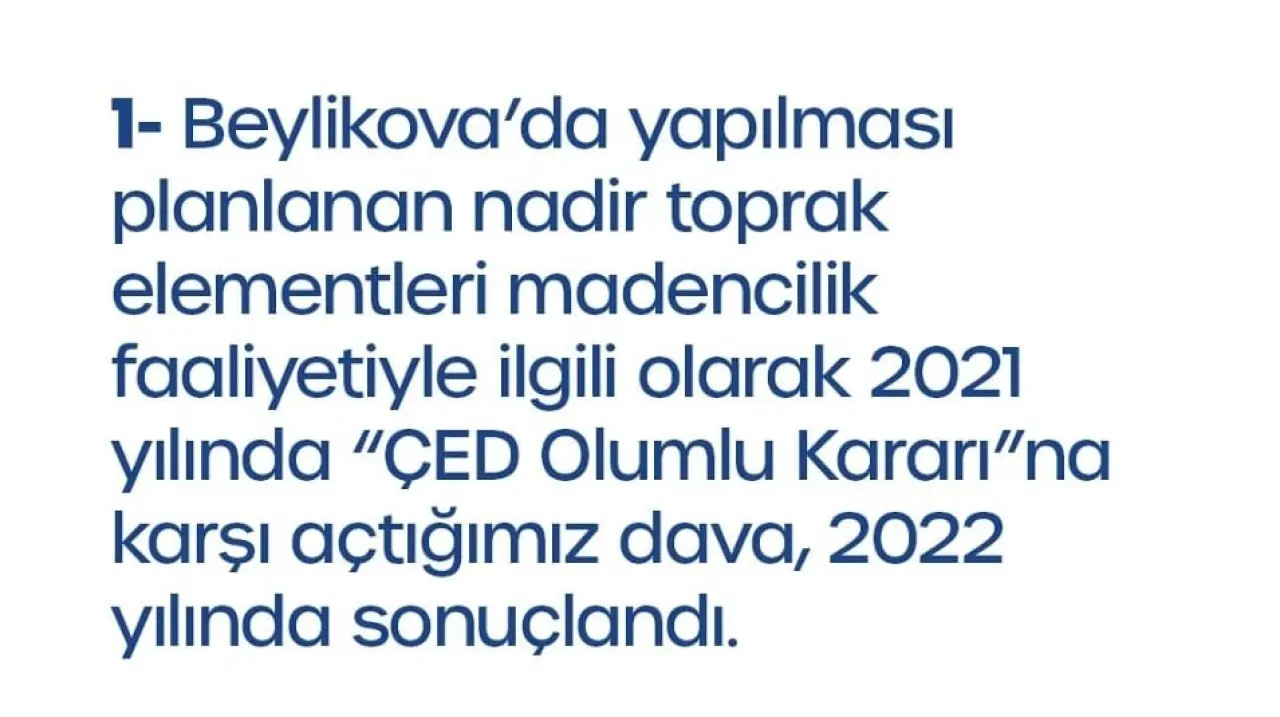 “Beylikova’da yapılması planlanan nadir toprak elementleri madencilik faaliyetiyle ilgili olarak 2021 yılında ‘ÇED Olumlu Kararı’na karşı açtığımız dava, 2022 yılında sonuçlandı. Şu anda süren herhangi bir dava bulunmamaktadır.”