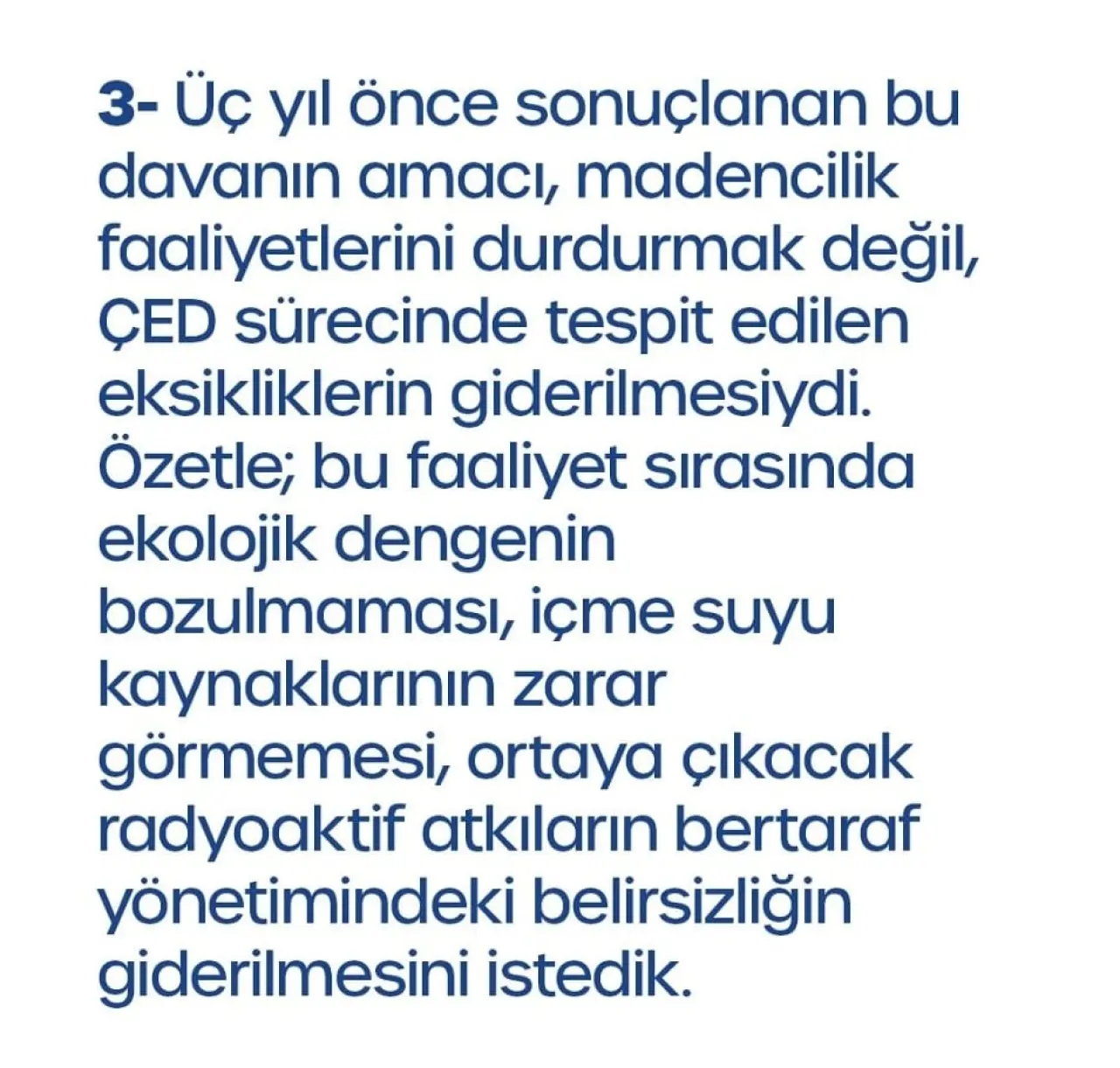 “Amaç madencilik faaliyetlerini durdurmak değil; ÇED sürecinde tespit edilen eksikliklerin giderilmesiydi. Ekolojik dengenin bozulmaması, içme suyu kaynaklarının zarar görmemesi ve radyokatif atıkların yönetimindeki belirsizliklerin giderilmesi istendi.”