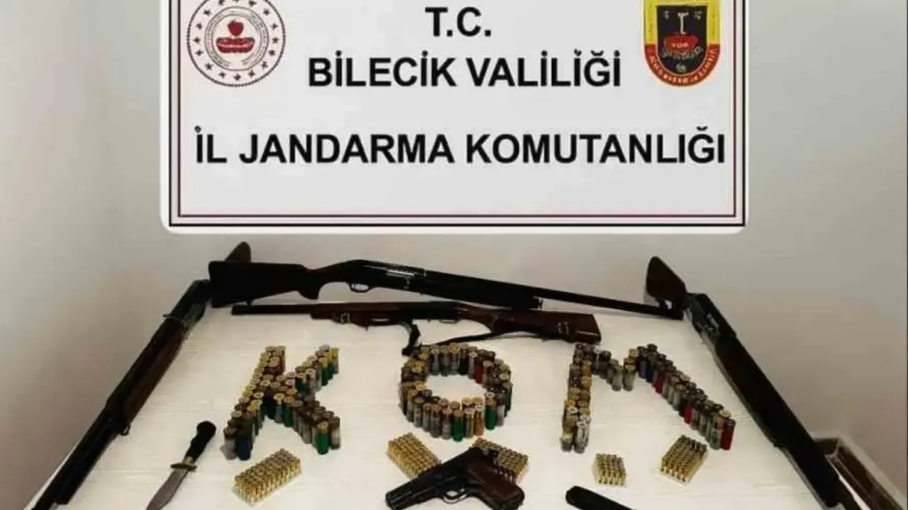 Bilecik İl Jandarma Komutanlığına bağlı ekipler kaçakçılıkla mücadele kapsamında bomba ve uyuşturucu arama köpek unsuruyla Söğüt ve İnhisar ilçelerinde 3 şüpheli şahsa ait 5 ayrı adreste eş zamanlı operasyon gerçekleştirdi. Yapılan aramalarda 1 adet ruhsatsız tabanca, 2 adet şarjör, 229 adet tabanca fişeği, 4 adet ruhsatsız av tüfeği, 189 adet av tüfeği fişeği ve 1 adet tırtıklı, kabzalı bıçak ele geçirdi. Yapılan operasyonda gözaltına H.U., A.K. ve H.S. isimli şahıslar hakkında adli tahkikata başlatıldı.