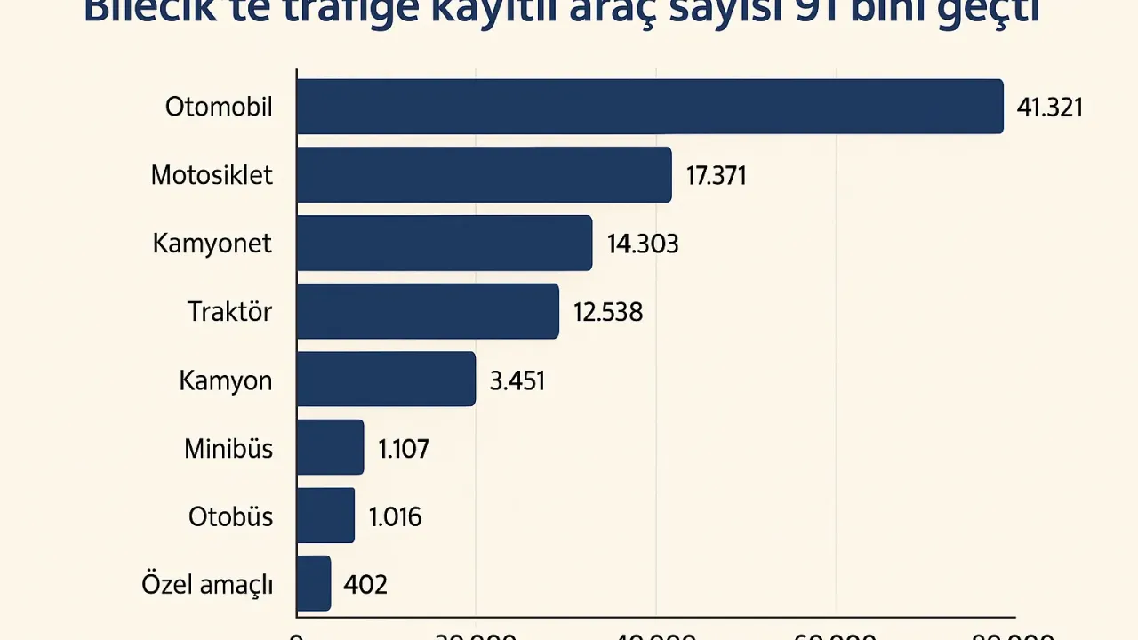 TÜİK’ten edinilen bilgiye göre, Mayıs ayı sonu itibari ile trafiğe kayıtlı toplam araç sayısı bir önceki aya göre bin 230 adet artarak, 91 bin 509’a ulaştı. Bilecik’teki taşıtların 41 bin 321 adeti otomobil, 17 bin 371’i motosiklet, 14 bin 303 adeti kamyonet, 12 bin 538 adeti traktör, 3 bin 451 adeti kamyon, bin 107 adeti minibüs, bin 16 adeti otobüs, 402 adeti ise özel amaçlı taşıtlar oluşturuyor.