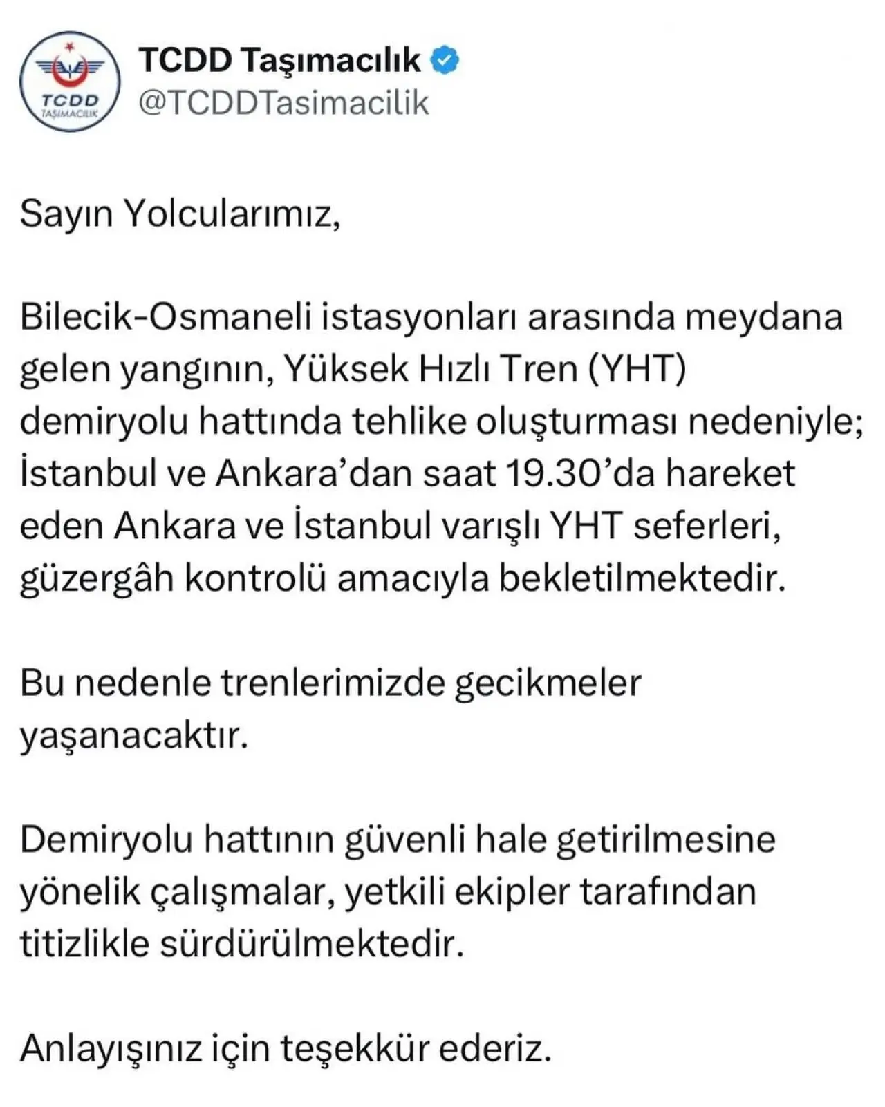 Yapılan açıklamada, “Bilecik-Osmaneli istasyonları arasında meydana gelen yangının Yüksek Hızlı Tren (YHT) demiryolu hattında tehlike oluşturması nedeniyle İstanbul ve Ankara'dan saat 19.30'da hareket eden Ankara ve İstanbul varışlı YHT seferleri, güzergâh kontrolü amacıyla bekletilmektedir. Bu nedenle trenlerimizde gecikmeler yaşanacaktır” ifadelerine yer verildi.