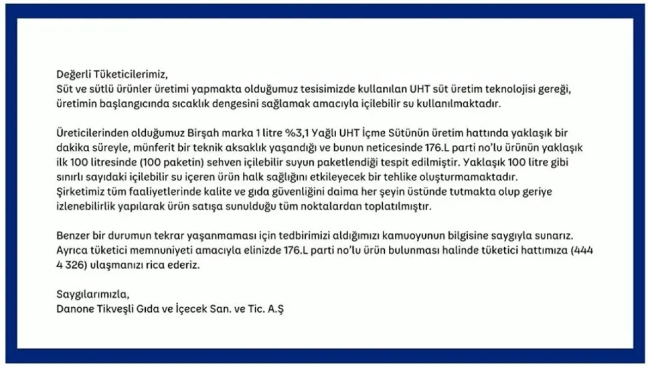 Üreticilerinden olduğumuz Birşah marka 1 litre %3,1 Yağlı UHT İçme Sütünün üretim hattında yaklaşık bir dakika süreyle, münferit bir teknik aksaklık yaşandığı ve bunun neticesinde 176.L parti no’lu ürünün yaklaşık ilk 100 litresinde (100 paketin) sehven içilebilir suyun paketlendiği tespit edilmiştir. Yaklaşık 100 litre gibi sınırlı sayıdaki içilebilir su içeren ürün halk sağlığını etkileyecek bir tehlike oluşturmamaktadır. Şirketimiz tüm faaliyetlerinde kalite ve gıda güvenliğini daima her şeyin üstünde tutmakta olup geriye izlenebilirlik yapılarak ürün satışa sunulduğu tüm noktalardan toplatılmıştır.