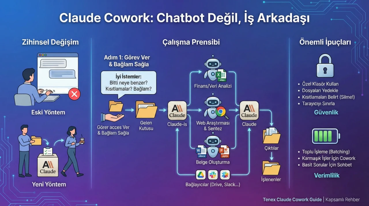 Cowork, işinizin geri kalanı için tasarlanmış Claude Code'dur. Aynı güçlü "ajan" mimarisine sahip, ancak terminale dokunmanızı gerektirmeyen bir arayüzle sunuluyor.