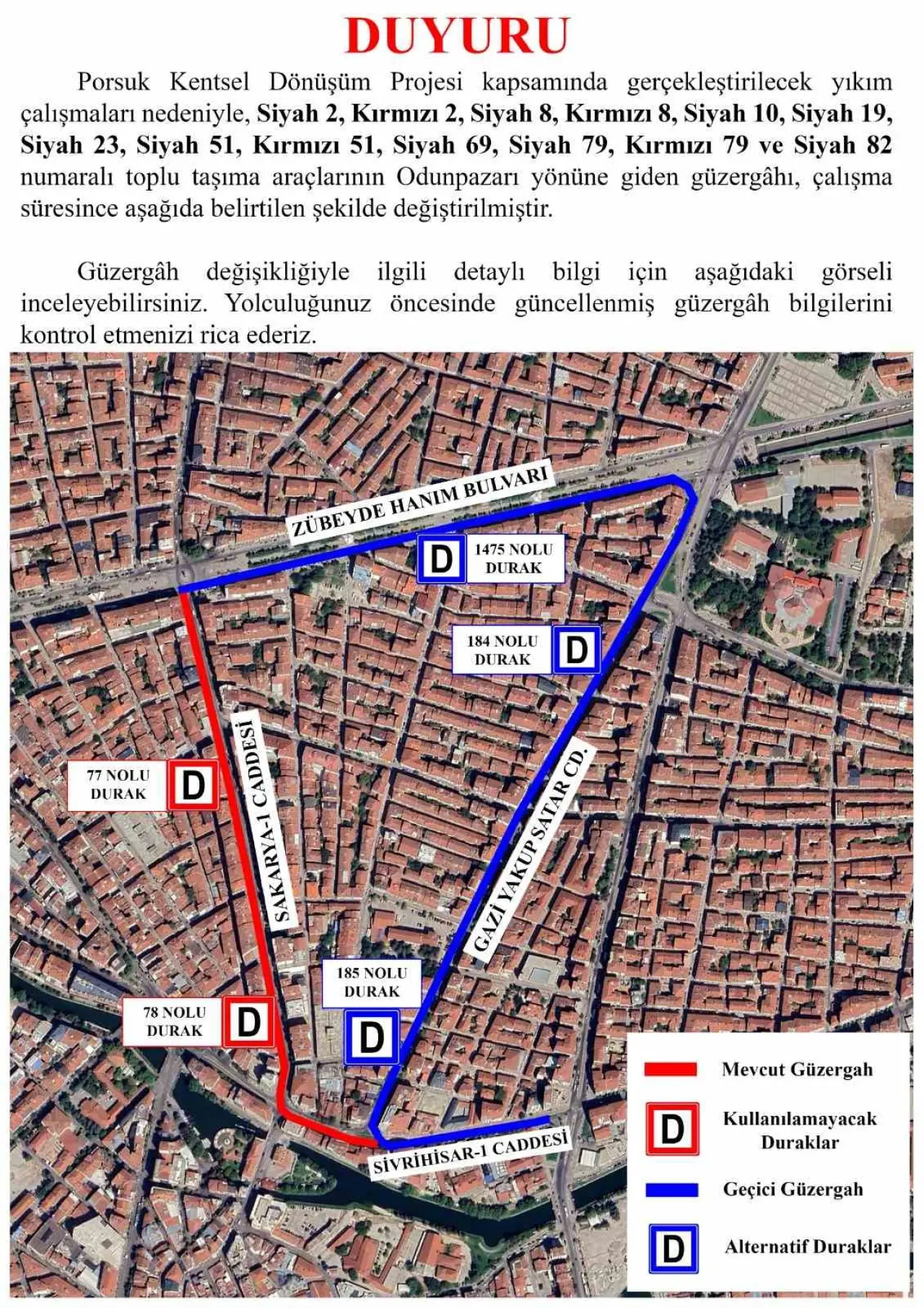 Büyükşehir Belediyesi Kentsel Dönüşüm Dairesi Başkanlığı, yenilenecek Halkevi binasının yıkım işlemlerine başlanacağı için sürücüleri ve yayaları alternatif güzergâhı kullanmaları konusunda uyardı. Yıkım çalışmaları nedeniyle toplu taşıma araçlarının da Odunpazarı yönüne giden güzergâhının çalışma süresince değiştirildiğini belirten yetkililer, "Şehrimiz Sivrihisar- 1 Caddesi üzerinde bulunan eski İş Bankası ve yanındaki binaların yıkım çalışmaları kapsamında 19 Mart Çarşamba gecesi saat 00.00 ile 23 Mart Pazar 00.00 arasında, Sivrihisar 1 Caddesinin Sakarya 1 Caddesi ile Gazi Yakup Satar Caddesi arasında otogar istikametinde kalan kısmı araç trafiğine kapatılacaktır. Çalışmalar nedeniyle Siyah 2, Kırmızı 2, Siyah 8, Kırmızı 8, Siyah 10, Siyah 19, Siyah 23, Siyah 51, Kırmızı 51, Siyah 69, Siyah 79, Kırmızı 79 ve Siyah 82 numaralı toplu taşıma araçlarının Odunpazarı yönüne giden güzergâhı güncellenmiştir. Sürücülerin trafik işaret ve işaretçilerine uymaları, alternatif güzergâhları kullanmaları rica olunur" açıklamasında bulundu.