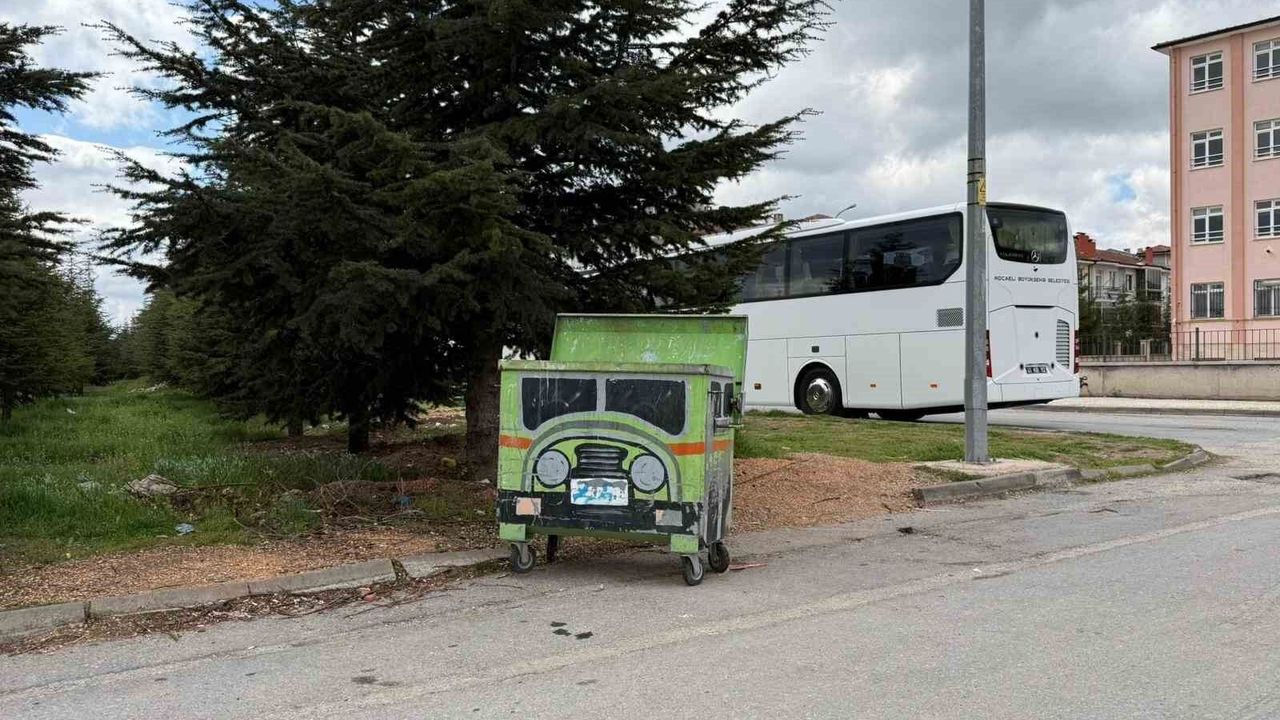 Çankaya Mahallesi Şehit Serdar Bahar Sokak’ta bulunan çöp konteyneri, tır kabini şeklinde boyanarak dikkat çekici bir görünüme kavuşturuldu. Yeşil renkli tasarımda far, ızgara ve plaka gibi detaylar da yer alıyor.