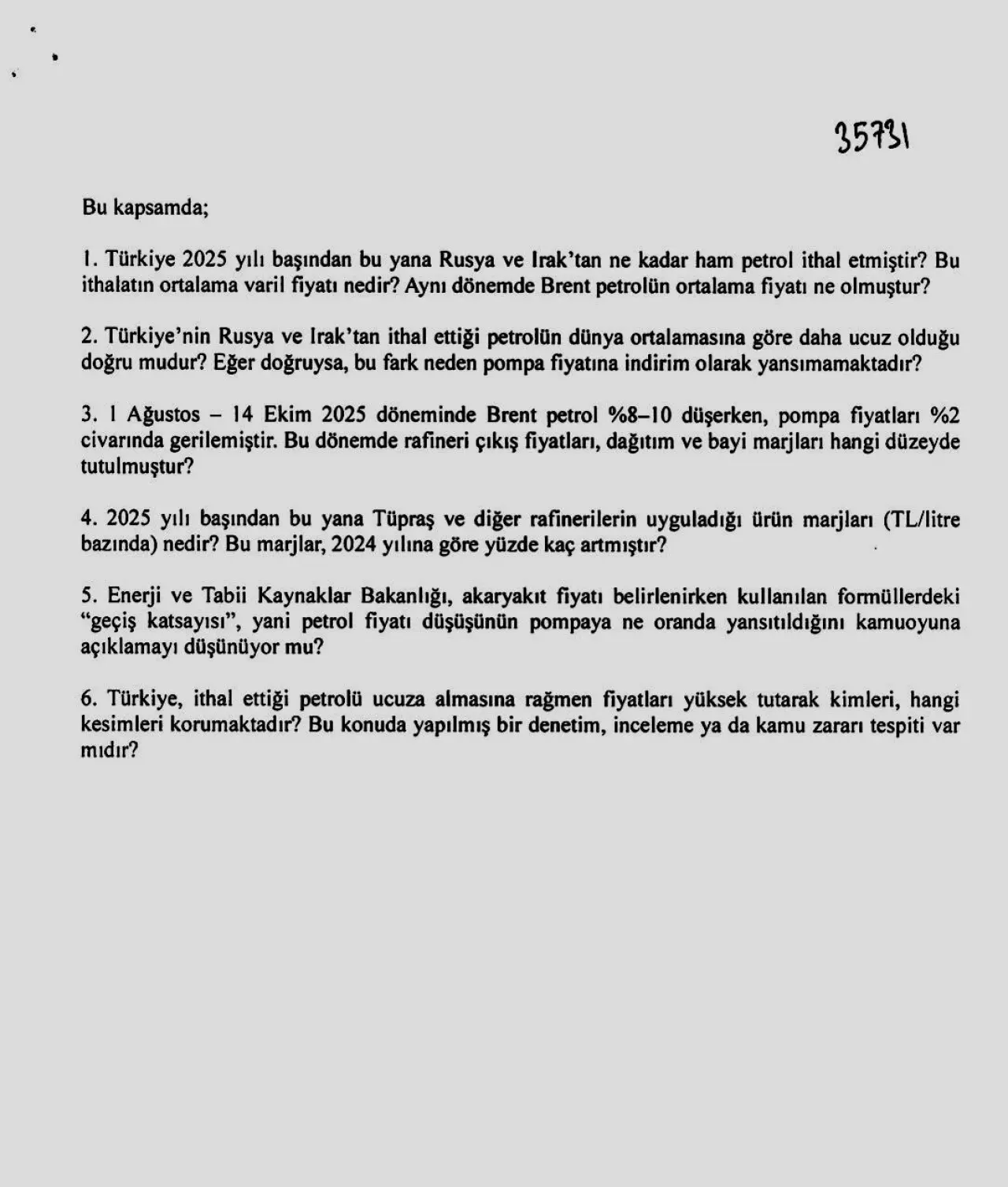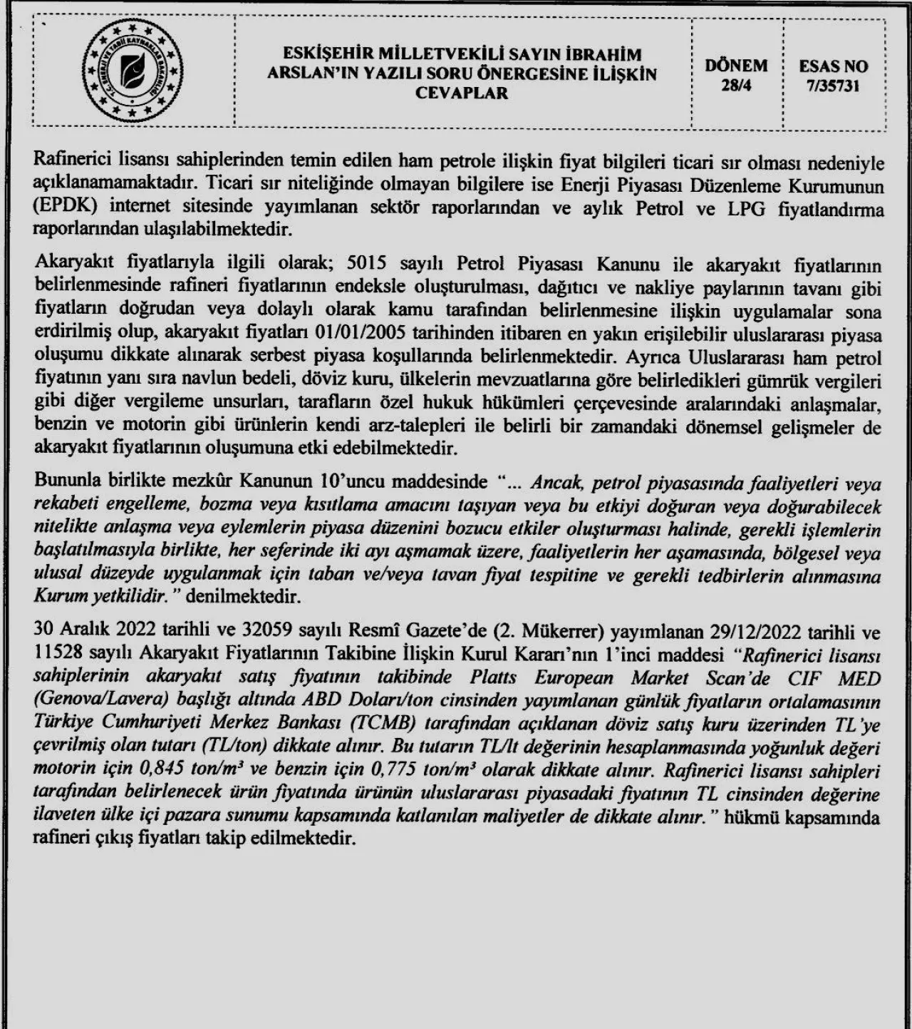 Bakanlığın verdiği yanıtta; petrolün kaça ithal edildiği, rafineri çıkış fiyatları, dağıtım ve bayi kâr marjları ile akaryakıt üzerinden alınan vergilerin fiyatlar üzerindeki etkisine dair hiçbir açıklama yapılmadığını dile getiren Arslan, sürecin şeffaflıktan uzak yürütüldüğünü söyledi.