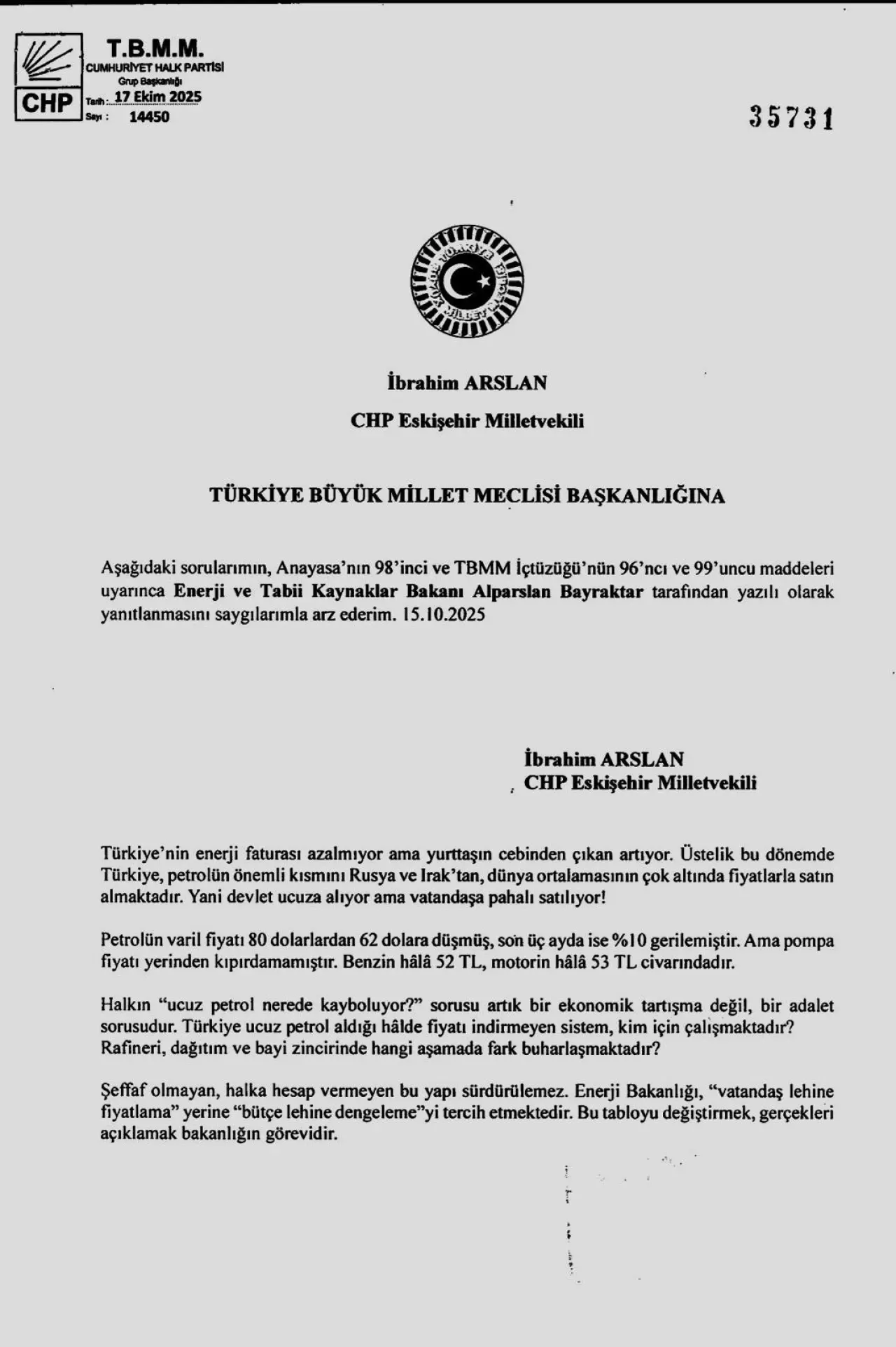 CHP Eskişehir Milletvekili İbrahim Arslan, petrol fiyatlarında yaşanan sert düşüşe rağmen akaryakıt fiyatlarının pompaya yansımamasını Enerji ve Tabii Kaynaklar Bakanlığı’na taşıdı. Arslan’ın soru önergesine verilen yazılı yanıtta, fiyat oluşumuna dair tek bir sayısal veri yer almaması dikkat çekti.