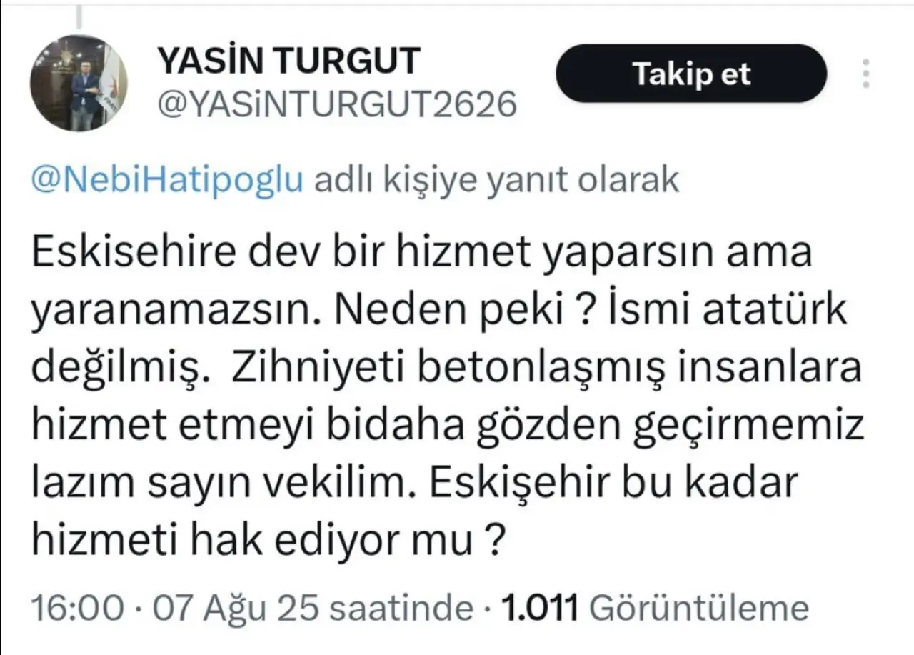Söz konusu kişinin, Eskişehir’de stadyuma Atatürk isminin verilmemesi nedeniyle gelen tepkilere karşılık, “Eskişehir bu kadar hizmeti hak ediyor mu?” ifadesini kullandığını belirten Arslan, tepkisini dile getiren vatandaşları da “zihniyeti betonlaşmış insanlar” sözleriyle hedef aldığını aktardı.
