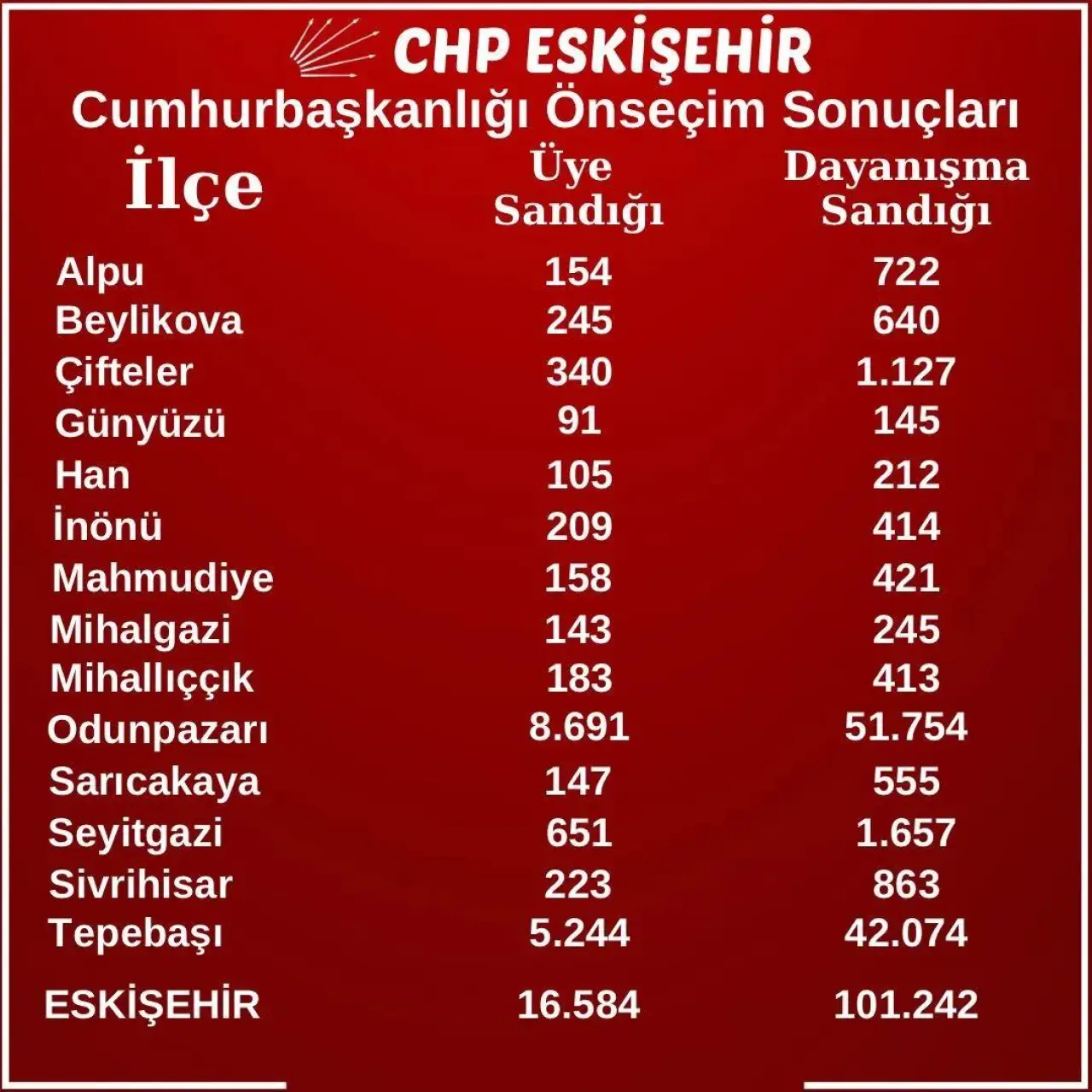 CHP’nin Cumhurbaşkanı adayını belirlemek için yaptığı ön seçimde Eskişehir genelinde toplam 118 bin 826 oy kullanıldı. Bu oyların 16 bin 584’ü CHP üyeleri tarafından, 101 bin 242’si ise dayanışma sandıklarında halk tarafından kullanıldı.