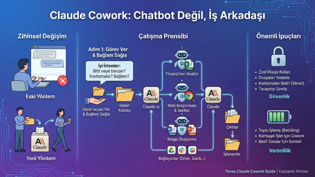 Cowork, işinizin geri kalanı için tasarlanmış Claude Code'dur. Aynı güçlü "ajan" mimarisine sahip, ancak terminale dokunmanızı gerektirmeyen bir arayüzle sunuluyor.