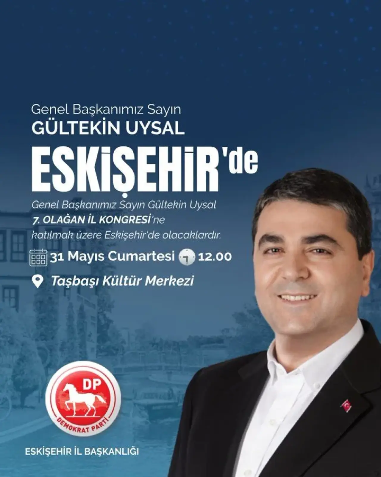 Genel Başkanımız Sayın Gültekin Uysal, Demokrat Parti 7. Olağan İl Kongresi için 31 Mayıs Cumartesi Saat 12.00’de Taşbaşı Kültür Merkezinde Eskişehirli gönüldaşlarımızla buluşacak.