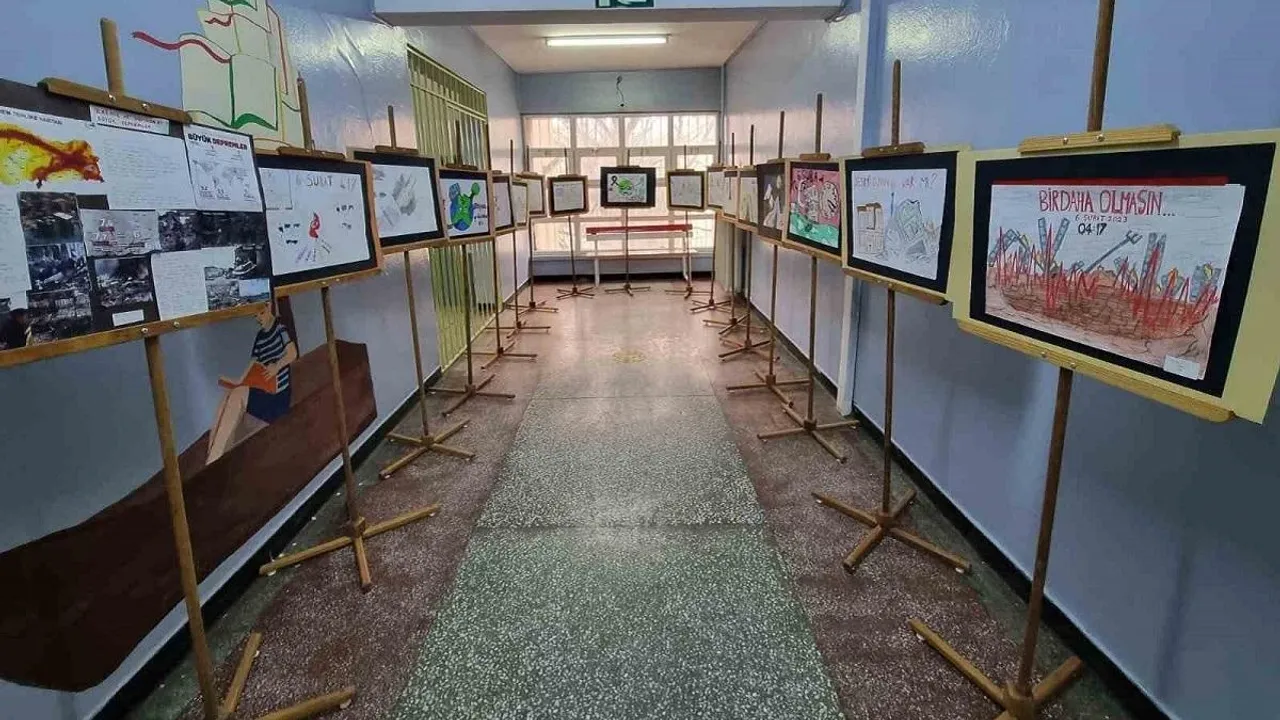 Deprem Anısına Sanatla Saygı Duruşu Sergisi, Eskişehir Ticaret Borsası Ortaokulu ve Ticaret Borsası İmam Hatip Ortaokulu, büyük bir felaketin anısını yaşatmak ve deprem konusunda toplumsal bilinci artırmak amacıyla, 'Deprem Şehitleri' temalı bir resim yarışması ve sergisi düzenledi. Okulların müdürü Oktay Turinay, serginin açılış konuşmasında, afette hayatını kaybedenlere Allah'tan rahmet, yaralananlara şifa, ve kayıpların yakınlarına sabır dileklerini iletti. Turinay, "Okul olarak, felaketin yaşandığı ilk andan itibaren öğrencilerimiz, velilerimiz ve öğretmenlerimizle birlikte yardım ve destek faaliyetlerinde bulunduk. Deprem anmasının yıl dönümünde düzenlediğimiz programımıza saygı duruşuyla başladık, ardından vefat edenler için Kuran tilaveti ve depremle ilgili bilgilendirici videoların gösterimi yapıldı. 6 Şubat depremine dair bir konuşma yaptım. Sonrasında ise öğrencilerimizin yarışmasında öne çıkan çalışmalar, okulumuzun sergi alanında sergilendi. Sergimiz öğretmenlerimizin, öğrencilerimizin ve velilerimizin ziyaretine açık. Resim sergisi köşesini düzenleyen görsel sanatlar öğretmenimize ve katkıda bulunan tüm öğrencilerimize teşekkür ederim," ifadelerini kullandı. [caption id="attachment_63042" align="alignnone" width="1200"]