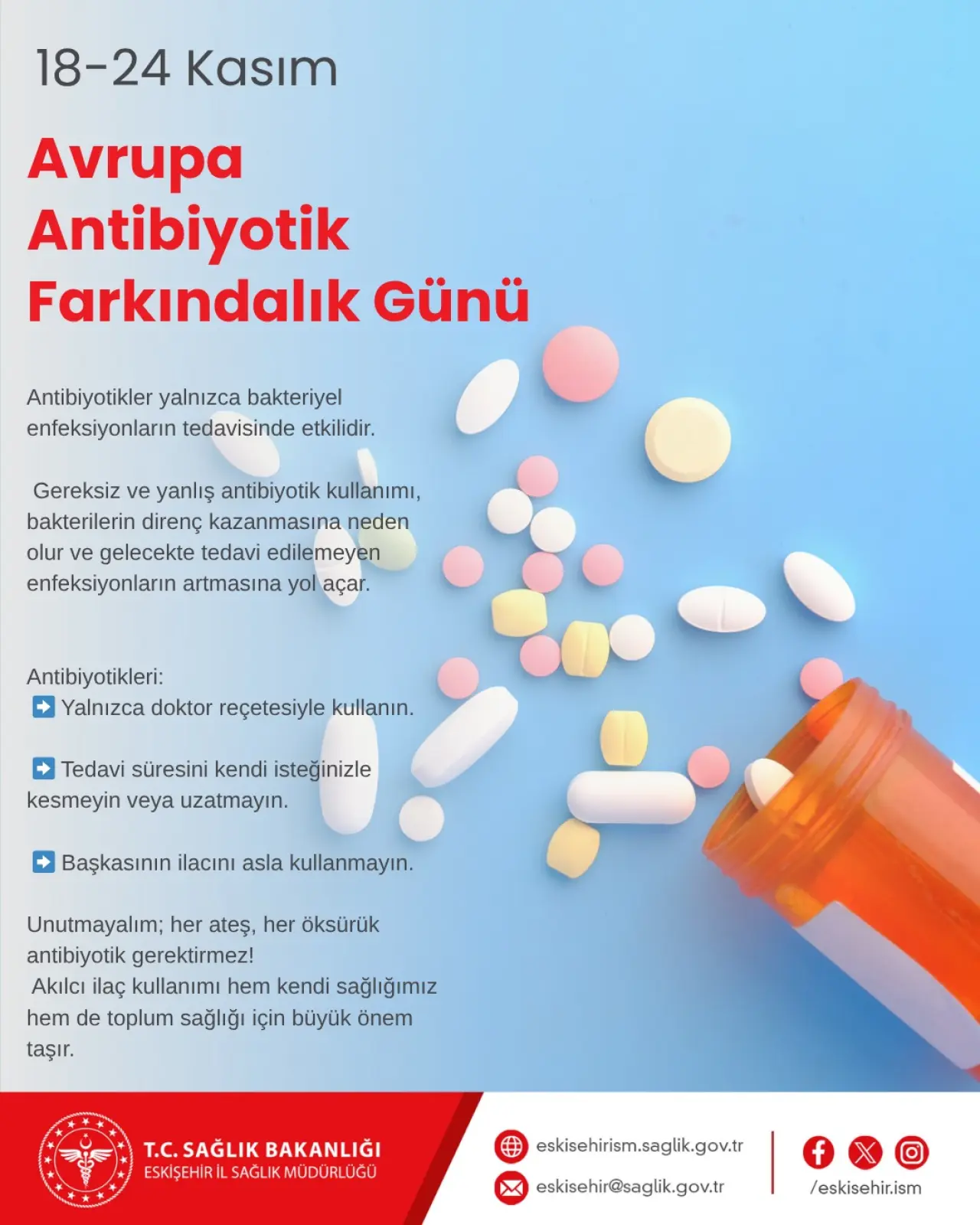 Gereksiz antibiyotik kullanımının dirençli bakteri türlerinin ortaya çıkmasına yol açtığını ve tedavi süreçlerini daha karmaşık hâle getirdiğini hatırlatan İl Sağlık Müdürlüğü yetkilileri, bu durumun hastalık sürelerini uzattığını, tedavi seçeneklerini azalttığını ve sağlık maliyetlerini artırdığını belirtti.