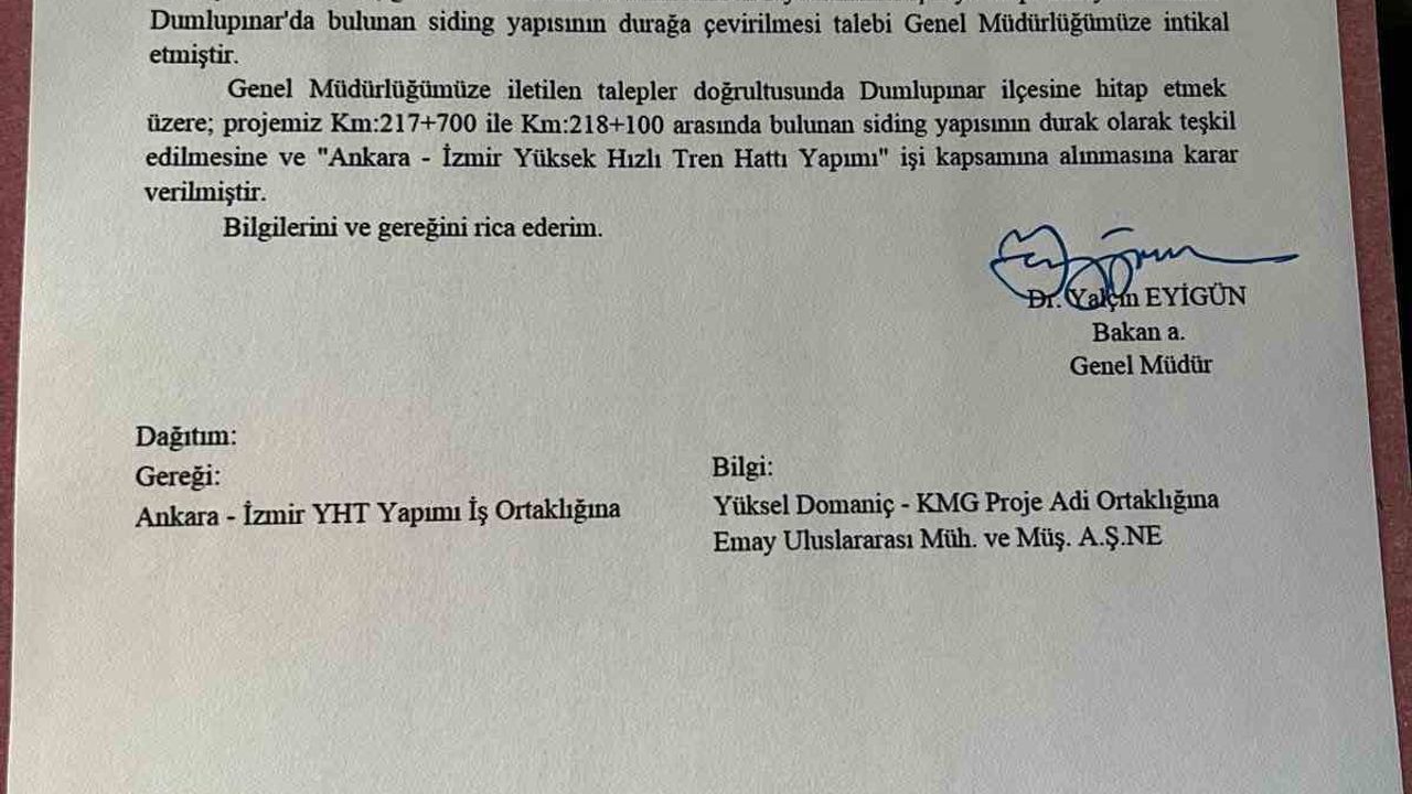 Başkan Işık, taleplerini AK Parti Kütahya İl Başkanı Ceyda Çetin Erenler ile milletvekilleri Adil Biçer, Mehmet Demir ve İsmail Çağlar Bayırcı aracılığıyla ilettiklerini belirtti. Ulaştırma ve Altyapı Bakanlığı’nın uygun görüşü ve Cumhurbaşkanı’nın kararnamesiyle onaylanan proje kapsamında, Dumlupınar sınırları içinde hızlı tren durağı yapılacak.