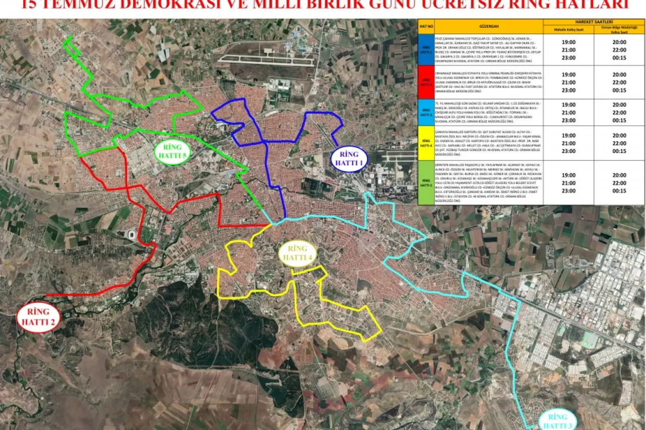 “15 Temmuz Demokrasi ve Millî Birlik Günü’nde, 80 numaralı hattımız hariç olmak üzere tüm toplu taşıma hatlarımız Pazar günü çalışma programına göre hizmet verecektir. 80 numaralı hattımız ise Cumartesi günü sefer programına göre hizmet verecektir. Ayrıca kent merkezinde belirlenen beş ayrı noktadan, saat 19.00 itibarıyla başlayacak şekilde Vilayet Meydanı’na ücretsiz ring seferleri düzenlenecektir. Vatandaşlar detaylı bilgi almak için www.eskisehir.bel.tr adresini inceleyebilirler.”