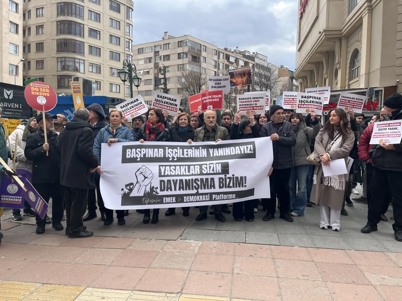 Emek ve Demokrasi Platformu, Başpınar’daki işçilerin mücadelelerini desteklediklerini belirterek dayanışma çağrısı yaptı. “İşçilerin hakları için yürüttüğü mücadeleyi destekliyoruz. Ülkenin dört bir yanında bu yasakları yıkacak bir mücadelenin ve dayanışmanın örgütlenmesi önümüzde önemli bir görev olarak duruyor” denildi.