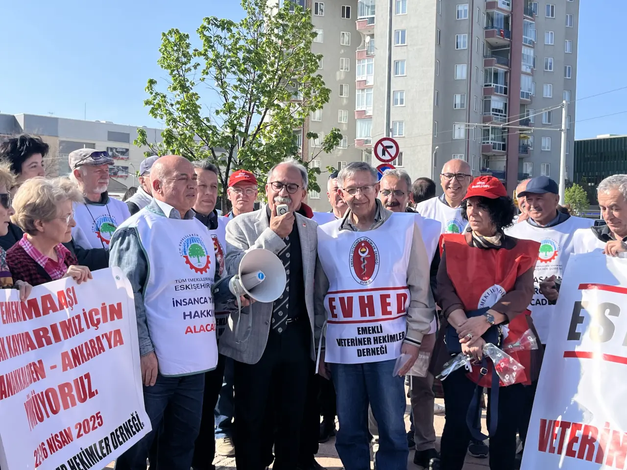 Emekli Veteriner Hekimleri Derneği emekli veteriner hekimlerin haklarının iyileştirilmesi ve taleplerinin yerine getirilmesi için Çanakkale’den Ankara’ya yürüyüş başlattı. 26 Nisan Cumartesi Ankara’da olacak olan yürüyüş kolu yürüyüşün 4. Gününde Eskişehir’de Ulus Anıtı önünde basın açıklaması gerçekleştirdi. Gerçekleştirilen basın açıklamasına CHP Eskişehir Milletvekilleri Jale Nur Süllü, İbrahim Arslan Utku Çakırözer, CHP İl Başkanı Talat Yalaz, Tüm Emeklilerin Sendikası, DİSK Emekli Sen Eskişehir Şubesi, Eskişehir Bilecik Tabip Odası da destek verdi. Ulus Anıtı önünde Emekli Veteriner Hekimleri Derneği Başkanı Uğur Görür, açıklamalarda bulundu.