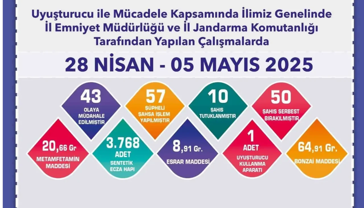 Edinilen bilgilere göre, İl Emniyet Müdürlüğü ve İl Jandarma Komutanlığı ekiplerinin uyuşturucu ile mücadele çalışmaları sürüyor. Bu çerçevede, kent genelinde 28 Nisan - 5 Mayıs tarihleri arasında çalışma yapıldı. Ekiplerin çalışmaları sonucunda 43 olaya müdahale edilirken, 57 şüpheliye işlem yapılıp, 10 şahıs tutuklandı ve 50 şahıs serbest bırakıldı. Ayrıca, 20,66 gram metamfetamin, 3 bin 768 adet sentetik ecza, 8,91 gram esrar, 1 adet uyuşturucu kullanma aparatı ve 64,91 gram bonzai maddesinin ele geçirildiği belirtildi.
