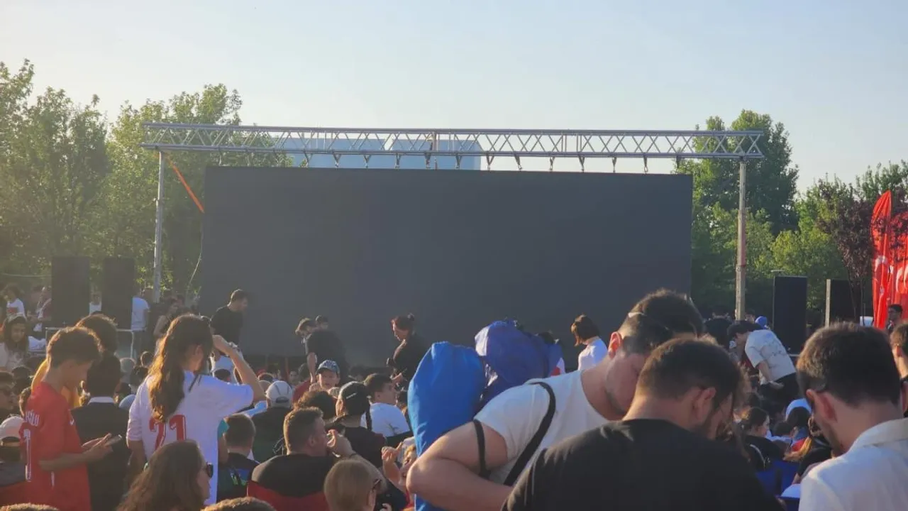 Eskişehir, Türkiye – Gençlikspor ve Tepebaşı Belediyesi tarafından ayrı ayrı noktalarda kurulan ancak Gençlikspor'un Dede Korkut Parkı'na kurulan dev ekranında Türkiye-Portekiz maçını izlemek üzere toplanan Eskişehirliler, yayın sorunu nedeniyle büyük hayal kırıklığına uğradı. Maçın ilk yarısını izleyemeyen kalabalık, görevlilerin yayın kurulamadığını ve tüm çabalarına rağmen sorunun giderilemediğini bildirmesi üzerine tepki gösterdi.