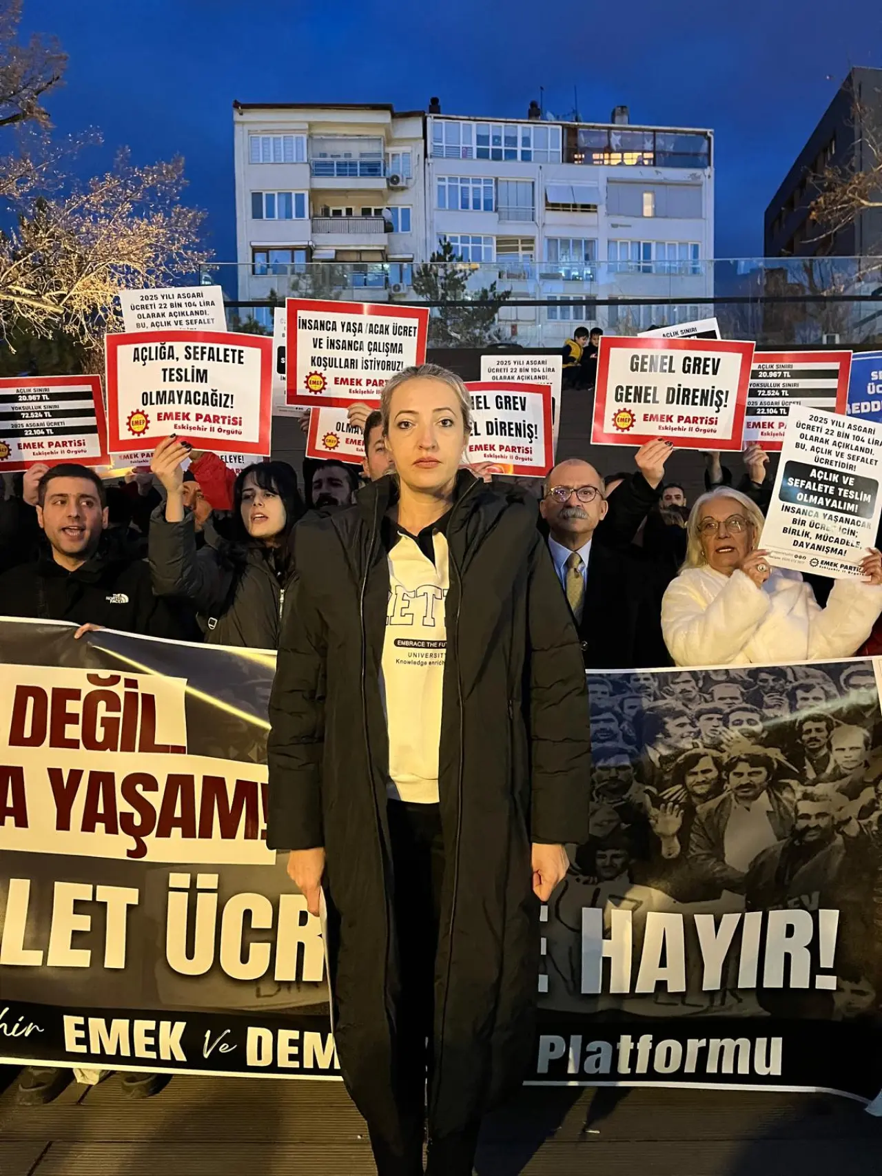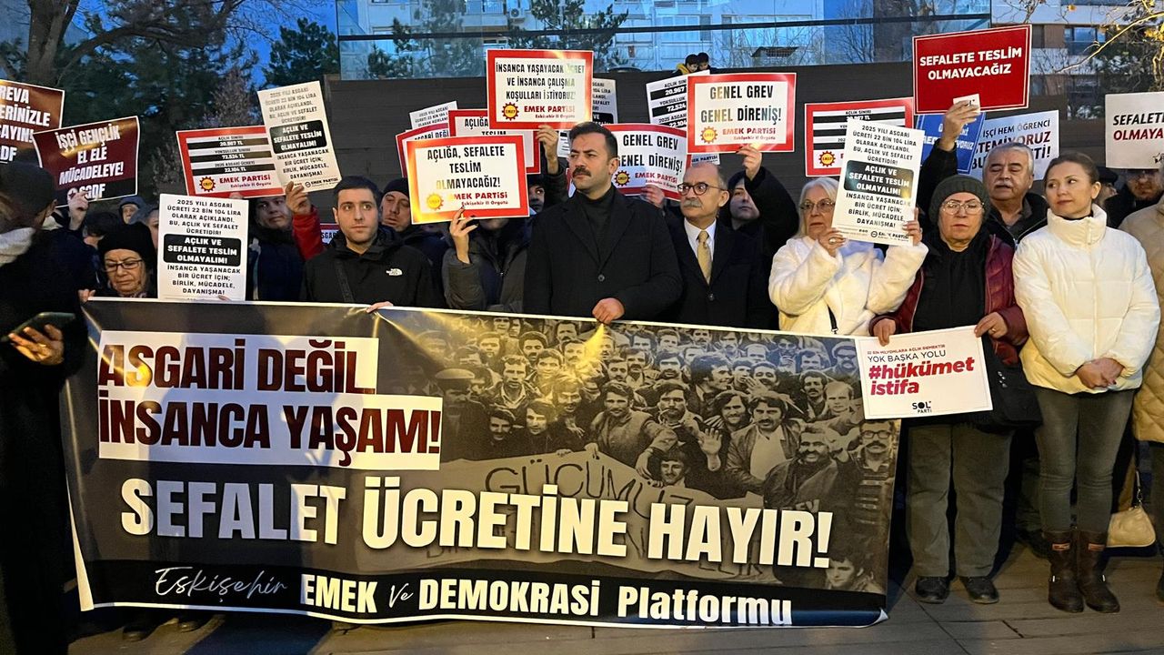 Eskişehir Emek ve Demokrasi Platformu adına açıklama yapan Zeynep Kaya, 2025 yılında uygulanacak asgari ücretin çalışma yaşamına etkilerini ve belirleme sürecini sert bir dille eleştirdi. Kaya, “2025 yılında uygulanacak asgari ücret, işveren kesimi ve hükümet tarafından herhangi bir teklif sunulmadan ya da göstermelik dahi olsa müzakere edilmeden, Çalışma ve Sosyal Güvenlik Bakanı tarafından açıklandı. Net 22 bin 104 TL; brüt ise 26 bin 5 TL olarak belirlenen bu ücret, İşçi düşmanlığının ve halk düşmanlığının bir göstergesidir,” dedi.