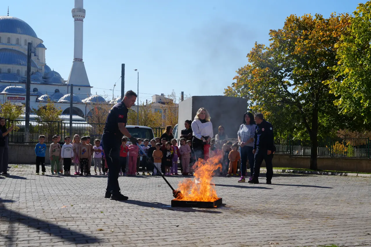 Öte yandan itfaiye personeli de Es Çocuk Evi’ni ziyaret ederek burada eğitim gören miniklere yangınla mücadelede kullanılan araç ve gereçleri tanıttı. Etkinlik kapsamında öğretmenlere de okul bahçesinde uygulamalı yangın söndürme eğitimi verildi.