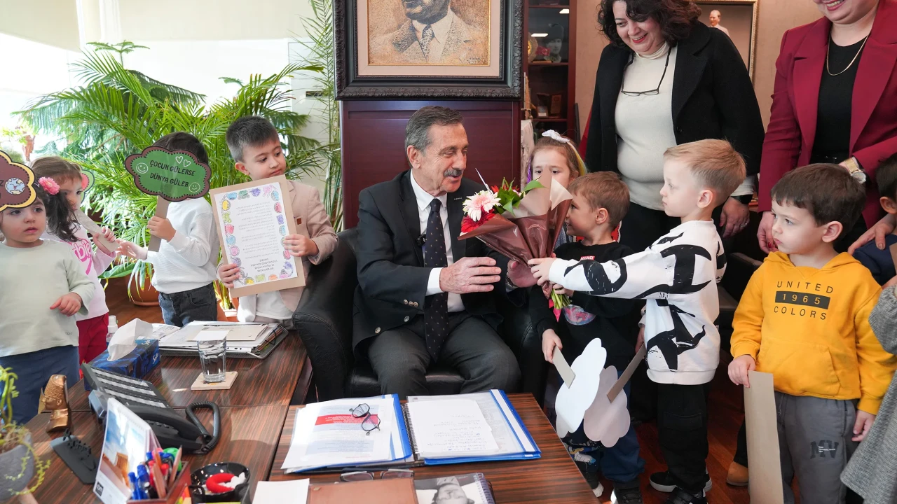 Minik öğrenciler hazırladıkları pankartları gösterip çiçek takdim ederken, Başkan Ataç da çocuklarla sohbet ederek hakları hakkında bilgilendirme yaptı.