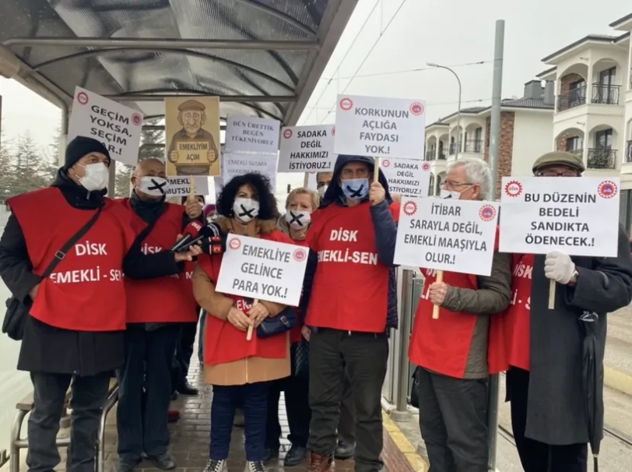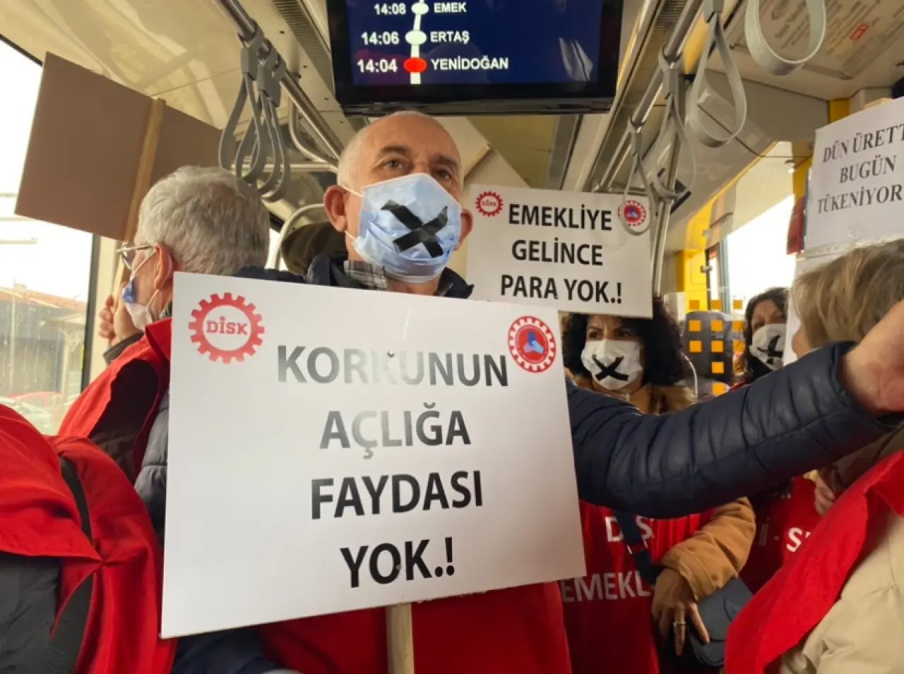 Belediyeden şehir hastanesine tramvayla giden emekliler, ağızlarına siyah bant takarak ve ellerinde dövizler taşıyarak sessiz bir eylem gerçekleştirdi.