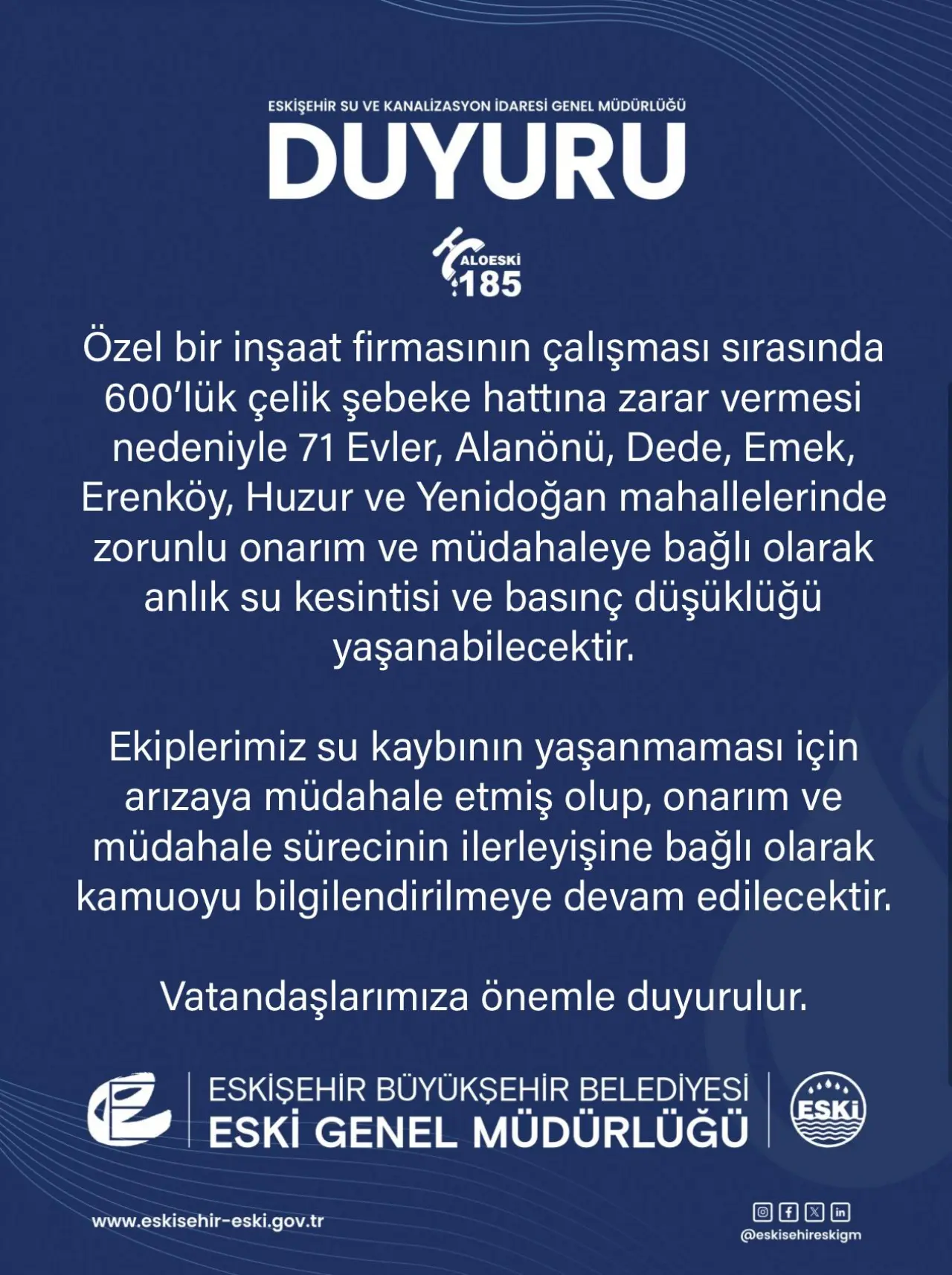 Eskişehir Büyükşehir Belediyesi Su ve Kanalizasyon İdaresi (ESKİ) Genel Müdürlüğü tarafından yapılan açıklamada, 600’lük çelik şebeke hattında meydana gelen zarar nedeniyle zorunlu onarım çalışmasının başlatıldığı ifade edildi. Çalışma nedeniyle 71 Evler, Alanönü, Dede, Emek, Erenköy, Huzur ve Yenidoğan mahallelerinde zaman zaman su kesintisi ve basınç düşüklüğü yaşanabileceği belirtildi.