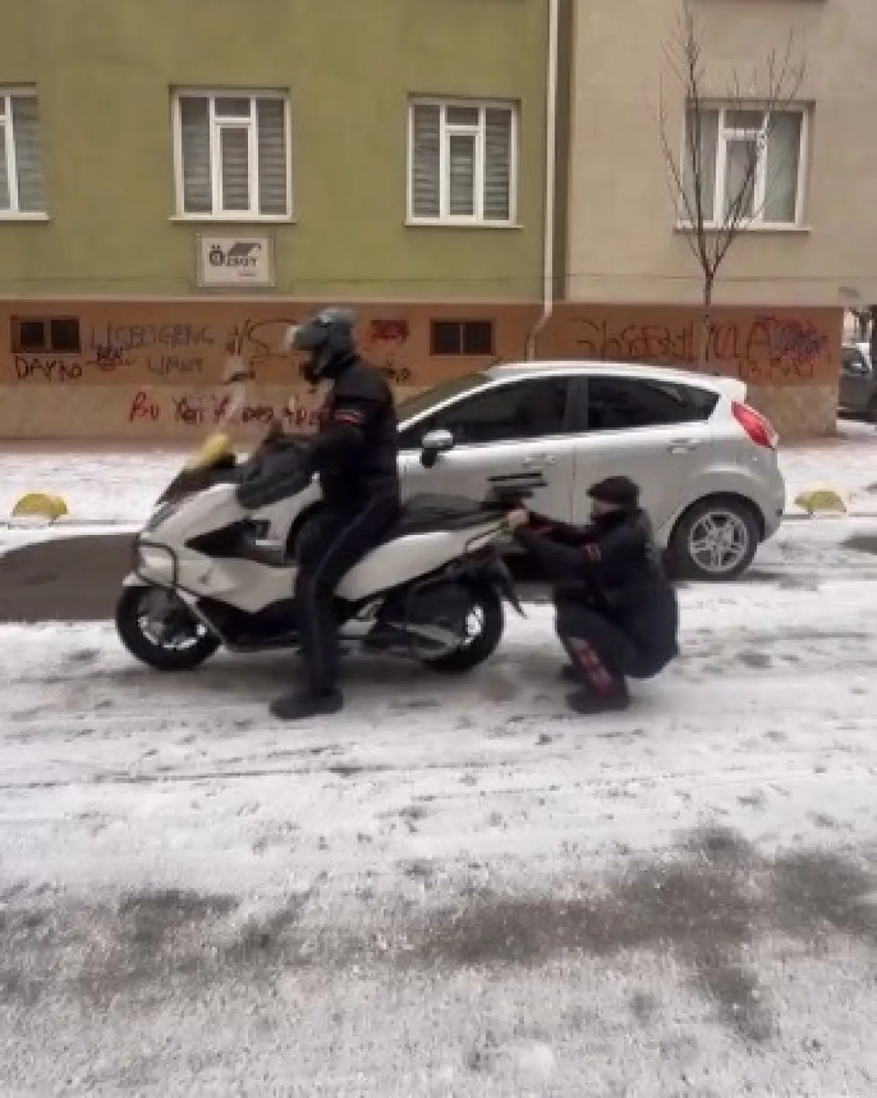 Görüntülerde, motosikletin buzlu zeminde ilerlemekte zaman zaman zorlandığı görülüyor. Kuryelerin birlikte geçirdiği bu eğlenceli anlar, sıradan bir iş günü sırasında ortaya çıkan keyifli bir sürpriz niteliğinde. Kaygan zemin, normalde tehlikeli olabilecek bir durumu, iki arkadaşın eğlenceli anına dönüştürdü.