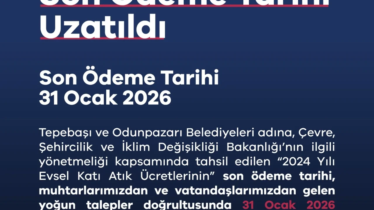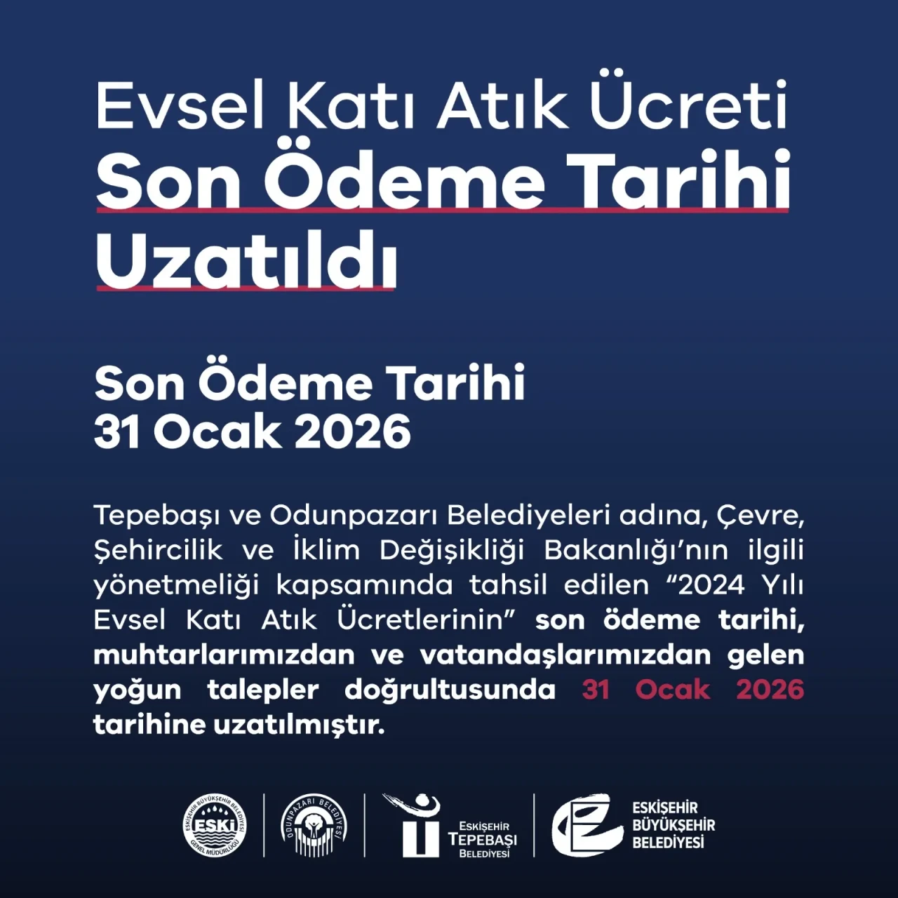 Tepebaşı ve Odunpazarı Belediyeleri adına, Çevre, Şehircilik ve İklim Değişikliği Bakanlığı’nın ilgili yönetmeliği kapsamında tahsil edilen 2024 yılı Evsel Katı Atık Ücretlerinin son ödeme tarihi uzatıldı. Muhtarlar ve vatandaşlardan gelen yoğun talep ile veznelerde yaşanan yoğunluk nedeniyle ödeme süresi 31 Ocak 2026 tarihine kadar uzatıldı.