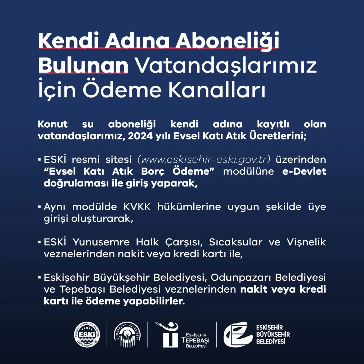 Konut su aboneliği kendi adına kayıtlı olan vatandaşlar, Evsel Katı Atık Ücretlerini ESKİ’nin resmi internet sitesi üzerinden e-Devlet doğrulamasıyla ‘Evsel Katı Atık Borç Ödeme’ modülünden, KVKK hükümlerine uygun şekilde oluşturulan üye girişiyle ya da ESKİ Yunusemre Halk Çarşısı, Sıcaksular ve Vişnelik veznelerinden nakit veya kredi kartı ile ödeyebilecek. Ayrıca Eskişehir Büyükşehir Belediyesi, Odunpazarı Belediyesi ve Tepebaşı Belediyesi veznelerinden de ödeme yapılabilecek.