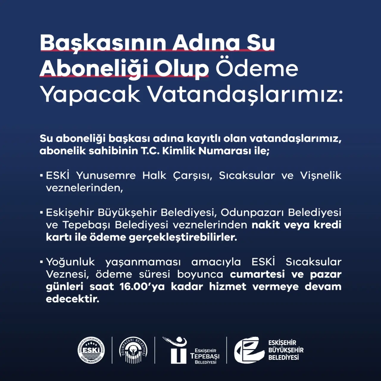 Su aboneliği başkası adına kayıtlı olan vatandaşlar ise, abonelik sahibinin T.C. kimlik numarası ile ESKİ vezneleri ile belediye veznelerinden nakit veya kredi kartı kullanarak ödeme gerçekleştirebilecek.