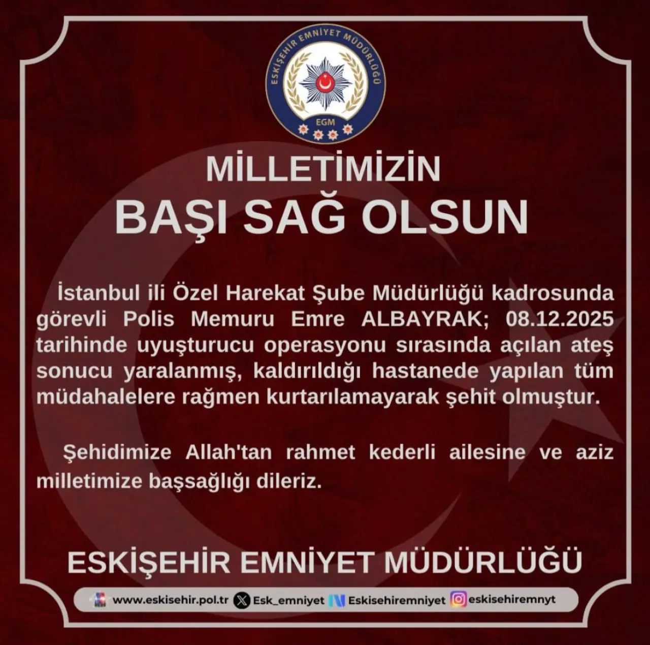 İl Emniyet Müdürlüğünün resmi sosyal medya hesabında yayınlanan mesajda, "İstanbul ili Özel Harekat Şube Müdürlüğü kadrosunda görevli Polis Memuru Emre Albayrak; 08.12.2025 tarihinde uyuşturucu operasyonu sırasında açılan ateş sonucu yaralanmış, kaldırıldığı hastanede yapılan tüm müdahalelere rağmen kurtarılamayarak şehit olmuştur. Şehidimize Allah’tan rahmet kederli ailesine ve aziz milletimize başsağlığı dileriz" ifadeleri kullanıldı.