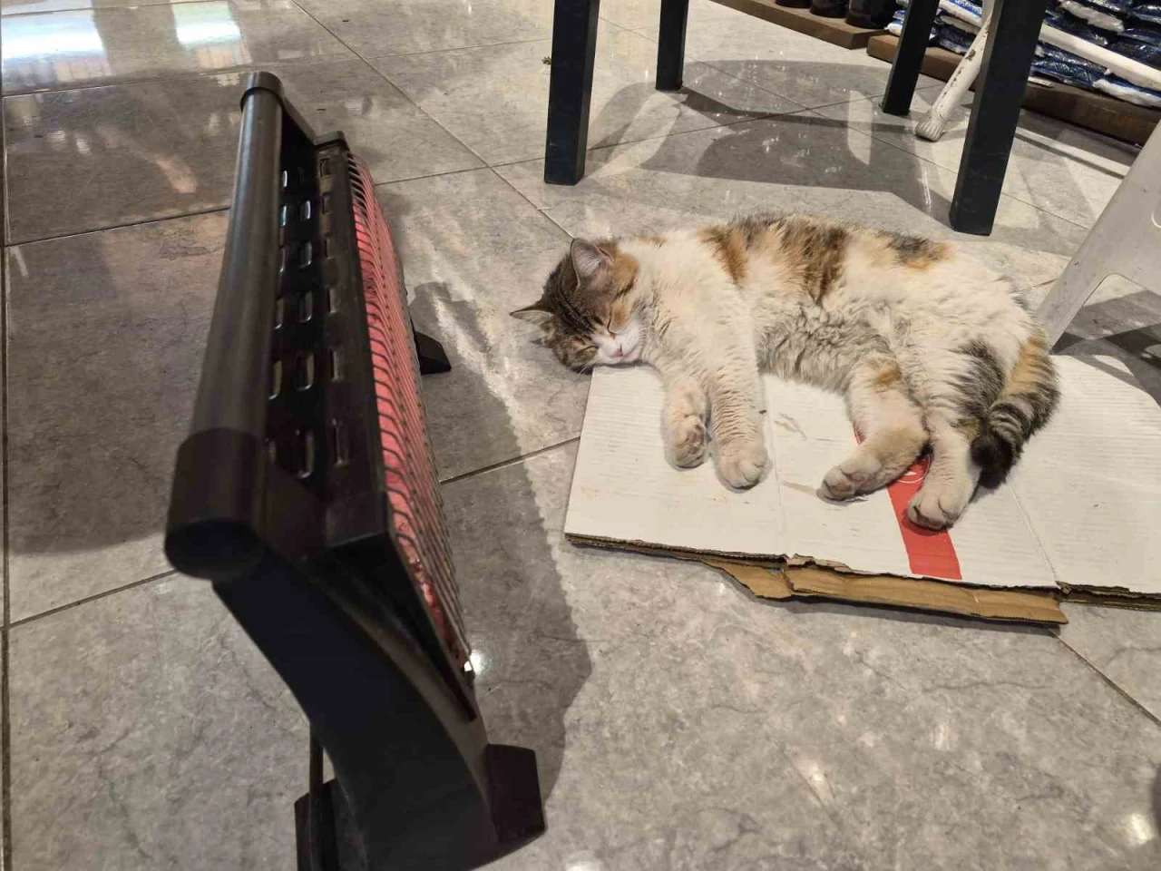 Esnafın kapısını açarak misafir ettiği kedi, içeride bulunan elektrikli ısıtıcının önüne geçerek kendisi için yere serilen kartonun üzerinde uykuya daldı. Ortaya çıkan sevimli görüntü, dükkâna alışveriş yapmak için gelen müşterilerin yüzünü güldürürken, esnafın duyarlı davranışı takdir topladı.