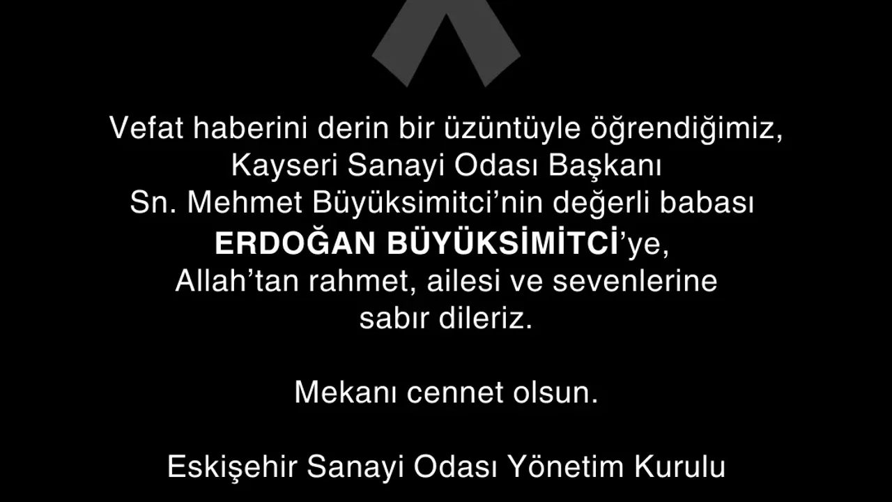 “Vefat haberini derin bir üzüntüyle öğrendiğimiz, Kayseri Sanayi Odası Başkanı Sn. Mehmet Büyüksimitci’nin değerli babası Erdoğan Büyüksimitçi’ye, Allah’tan rahmet, ailesi ve sevenlerine sabır dileriz. Mekânı cennet olsun.”