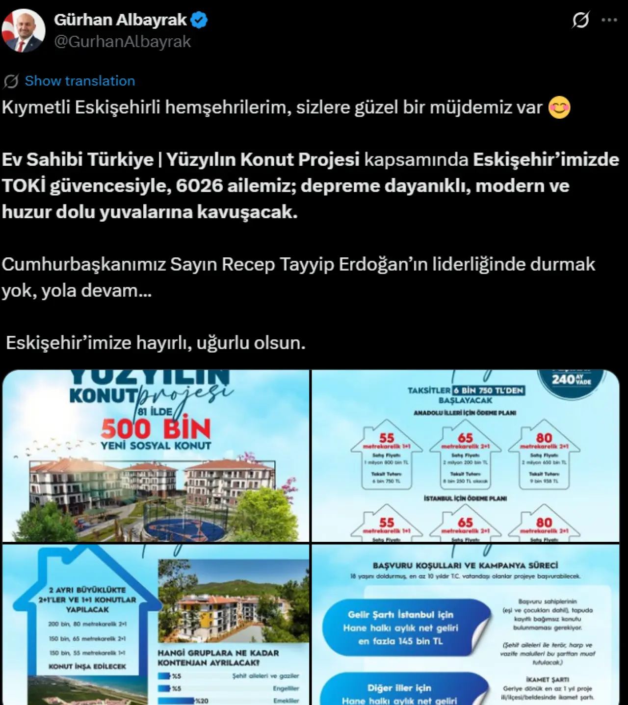 “Kıymetli Eskişehirli hemşehrilerim, sizlere güzel bir müjdemiz var. Ev Sahibi Türkiye Yüzyılın Konut Projesi kapsamında Eskişehir’imizde 6026 ailemiz, TOKİ güvencesiyle; depreme dayanıklı, modern ve huzur dolu yuvalarına kavuşacak. Sayın Cumhurbaşkanımız başta olmak üzere Çevre, Şehircilik ve İklim Değişikliği Bakanımız Murat Kurum’a, milletvekillerimize ve emeği geçen herkese şükranlarımı sunuyorum. Cumhurbaşkanımız Recep Tayyip Erdoğan’ın liderliğinde durmak yok, yola devam!