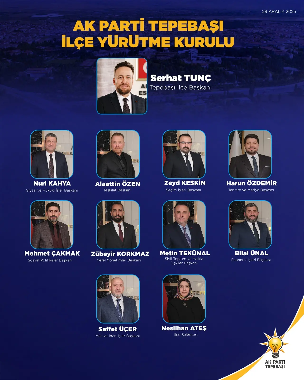 Tunç açıklamasında, “AK Parti Tepebaşı İlçe Başkanlığı olarak, davamıza gönül vermiş, Tepebaşı’mıza hizmet etme sorumluluğunu omuzlarında hisseden yol arkadaşlarımızla İlçe Yürütme Kurulumuzu açıklamış bulunuyoruz. Her biri bilgi, tecrübe ve samimiyetiyle teşkilatımıza güç katacak olan ilçe başkan yardımcılarımıza görevlerinde başarılar diliyorum” dedi.